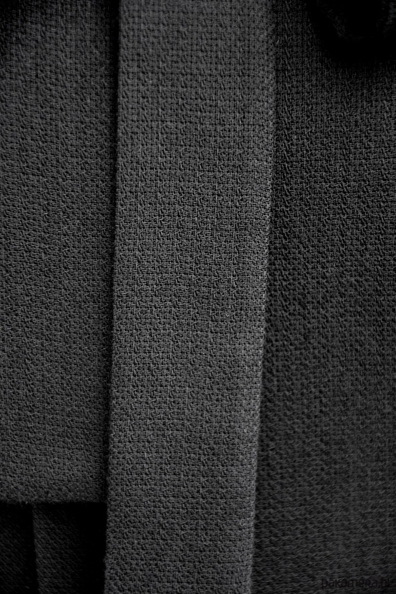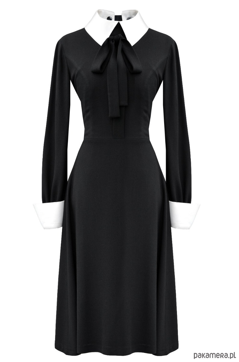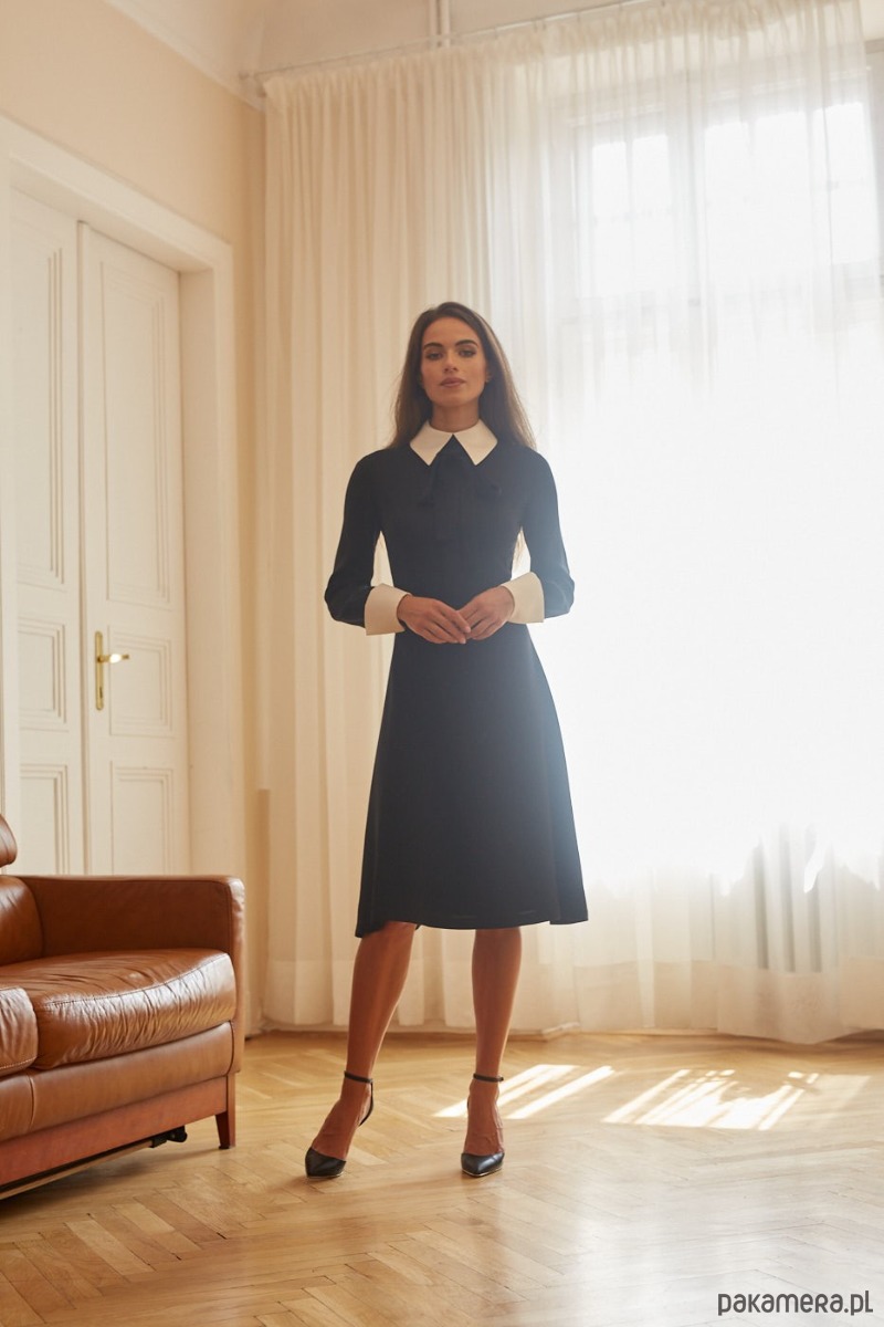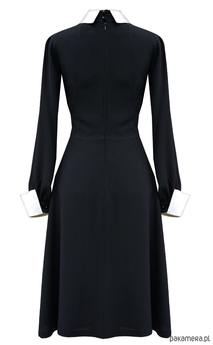 Tkanina- włoska wełna z lycrą. 98% wełna, 2% lycra. Kolor czarny. Na wiskozowej podszewce. Odpinany kołnierzyk i mankiety w kolorze śmietankowym- satyna 100% poliester. Dół trapezowy. Sukienkę można nosić również bez kołnierzyka i mankietów. Długość całkowita ok. 107 cm. Czyszczenie chemiczne.