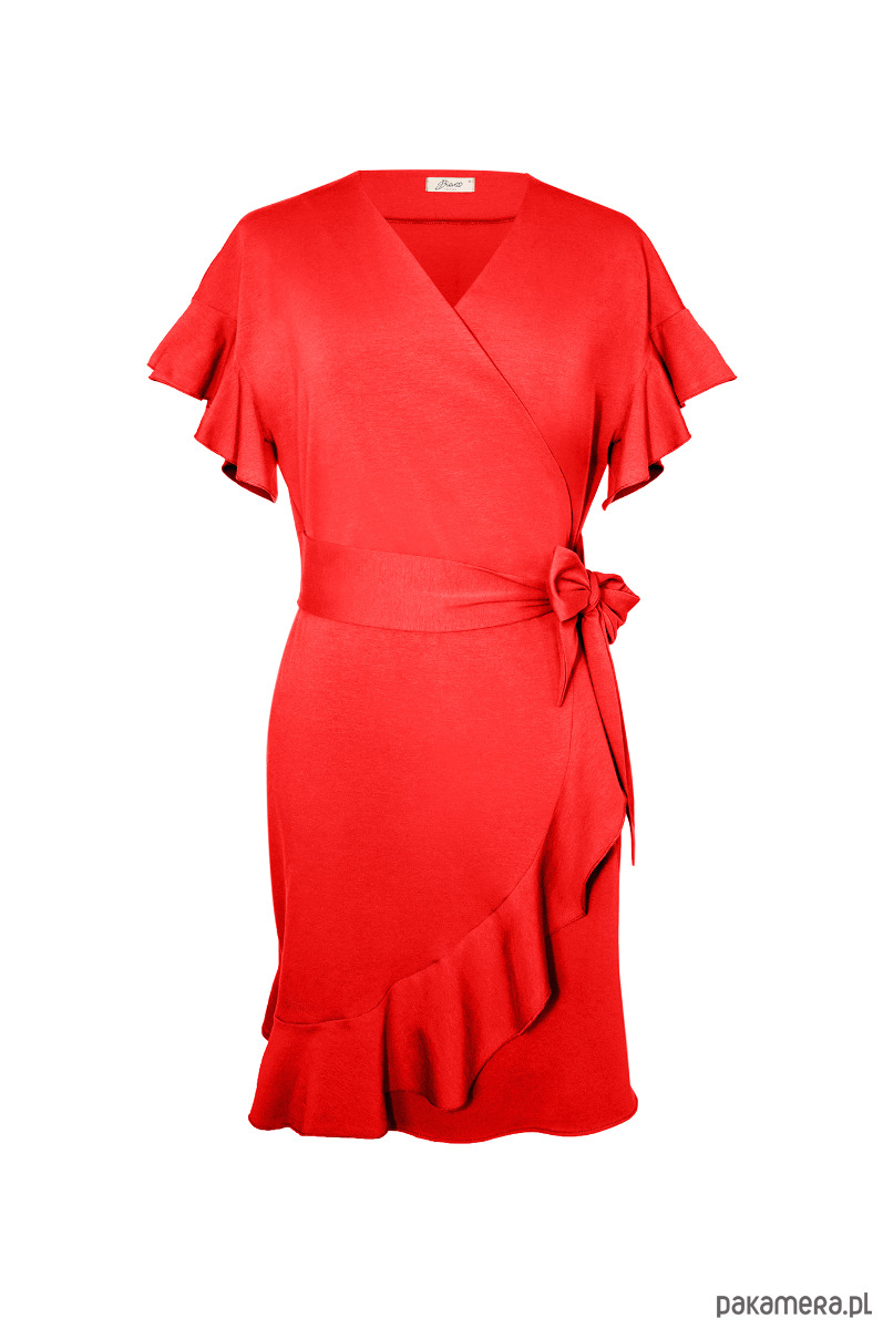 Czerwona sukienka zakładana kopertowo. Uszyta z naturalnej i oddychającej dzianiny polskiego producenta. Wykończona na dole i rękawach falbanką. Oryginalny szeroki pasek wiązany jest w talii, co dopasowuje sukienkę do sylwetki. Niezobowiązująca długość midi, gładki tył z zaszewkami. Wygodna i kobieca sukienka na lato.