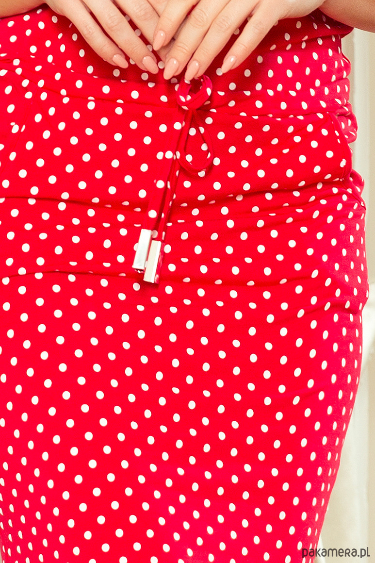 Sportowa sukienka z rękawkiem 3/4 i kieszonkami - czerwona w groszki. Produkt polski. Wykonana z przyjemnego w dotyku elastycznego materiału - wysokiej jakości polska wiskoza. Marka numoco.