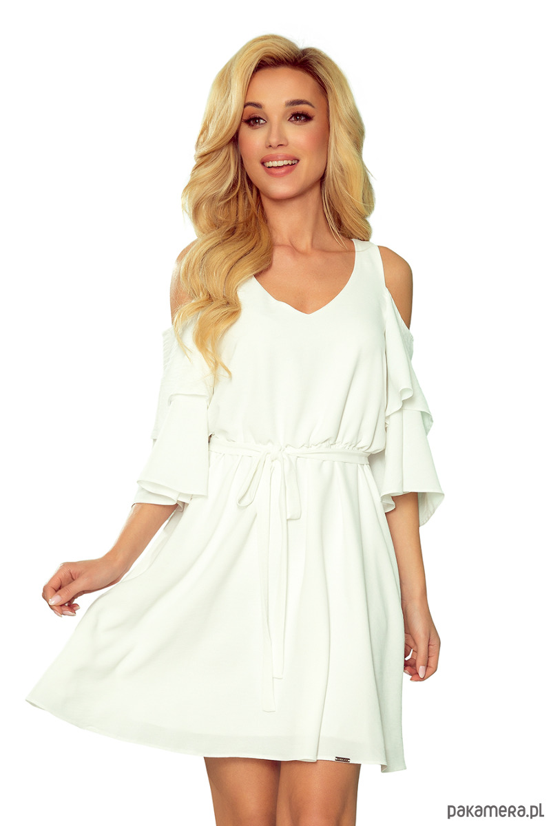 Marina - zwiewna sukienka z rozkloszowanymi podwójnymi rękawkami, dekoltem i gumeczką w pasie. Kolor: ecru. Marka numoco. Produkcja polska.