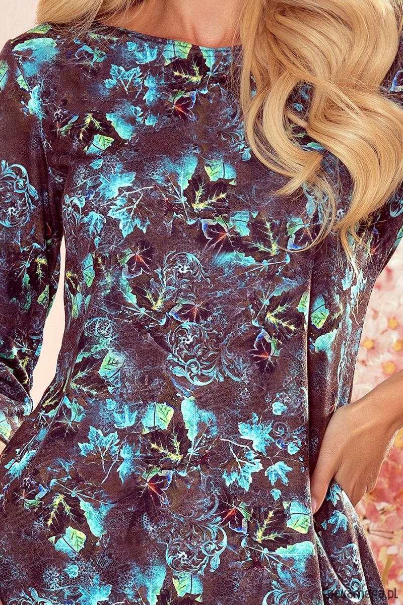 Sukienka z kieszonkami na biodrach - błękitne liście. Uszyta z przyjemnego grubszego materiału: 30 % wiskoza, 70 % poliester. Marka numoco.