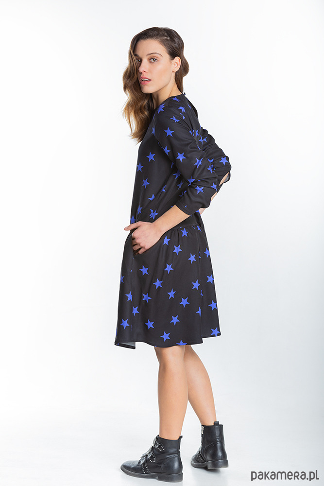 Sukienka z obniżonym stanem, długim rękawem i krytymi kieszeniami, uszyta z wysokogatunkowej 100% włoskiej wiskozy. Uroczy wzór w gwiazdy idealnie sprawdzi się podczas nadchodzących przyjęć świątecznych. Doskonale wygląda również z paskiem w talii.