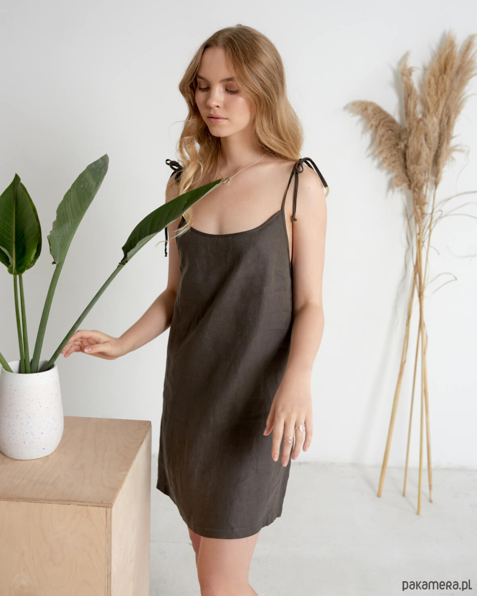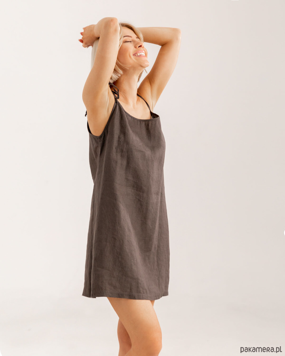 Sukienka lniana na wiązanych ramiączkach o długości 50 cm z możliwością regulacji długości. Idealna na co dzień, czy do spania. Modelka ma na sobie rozmiar S.