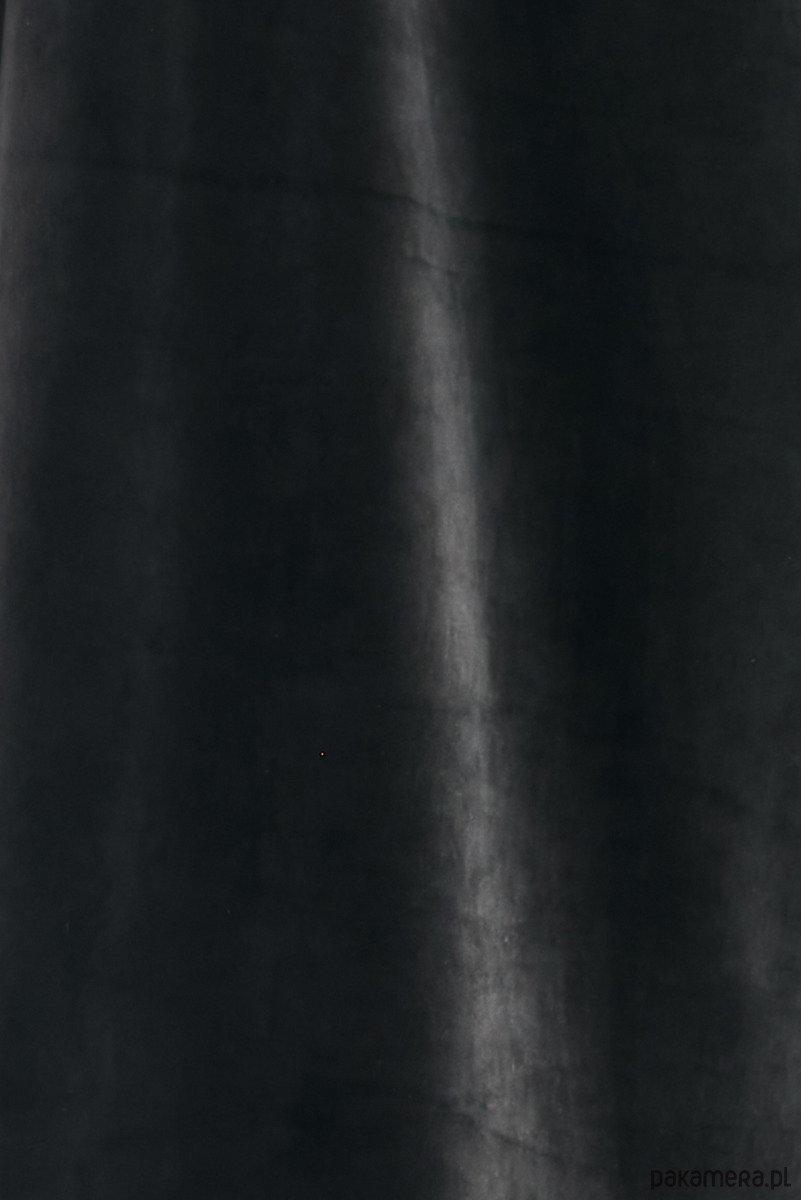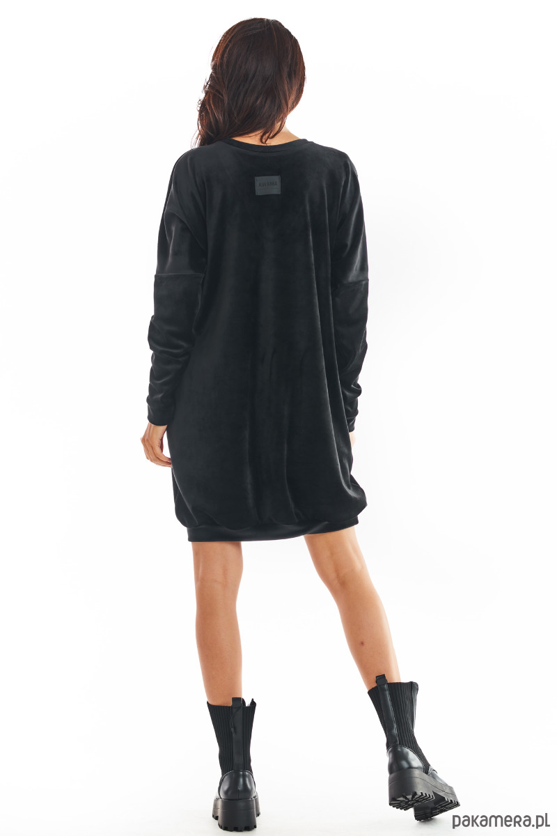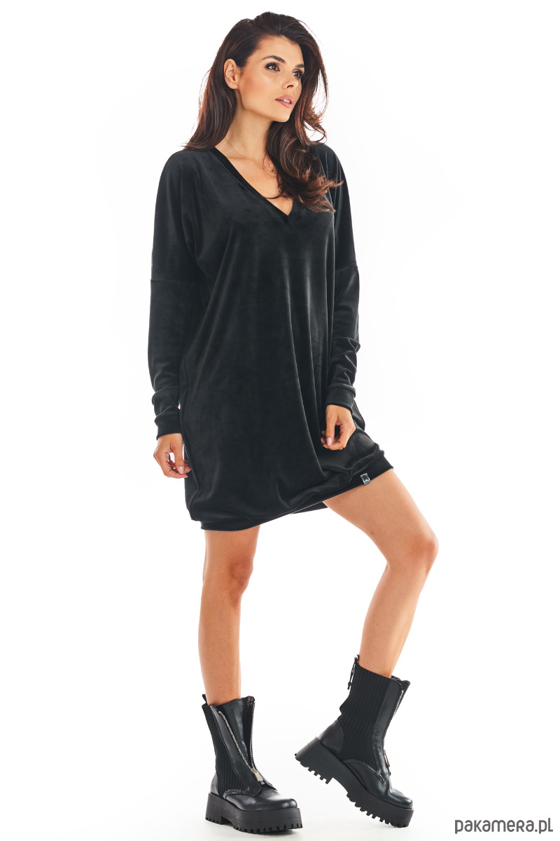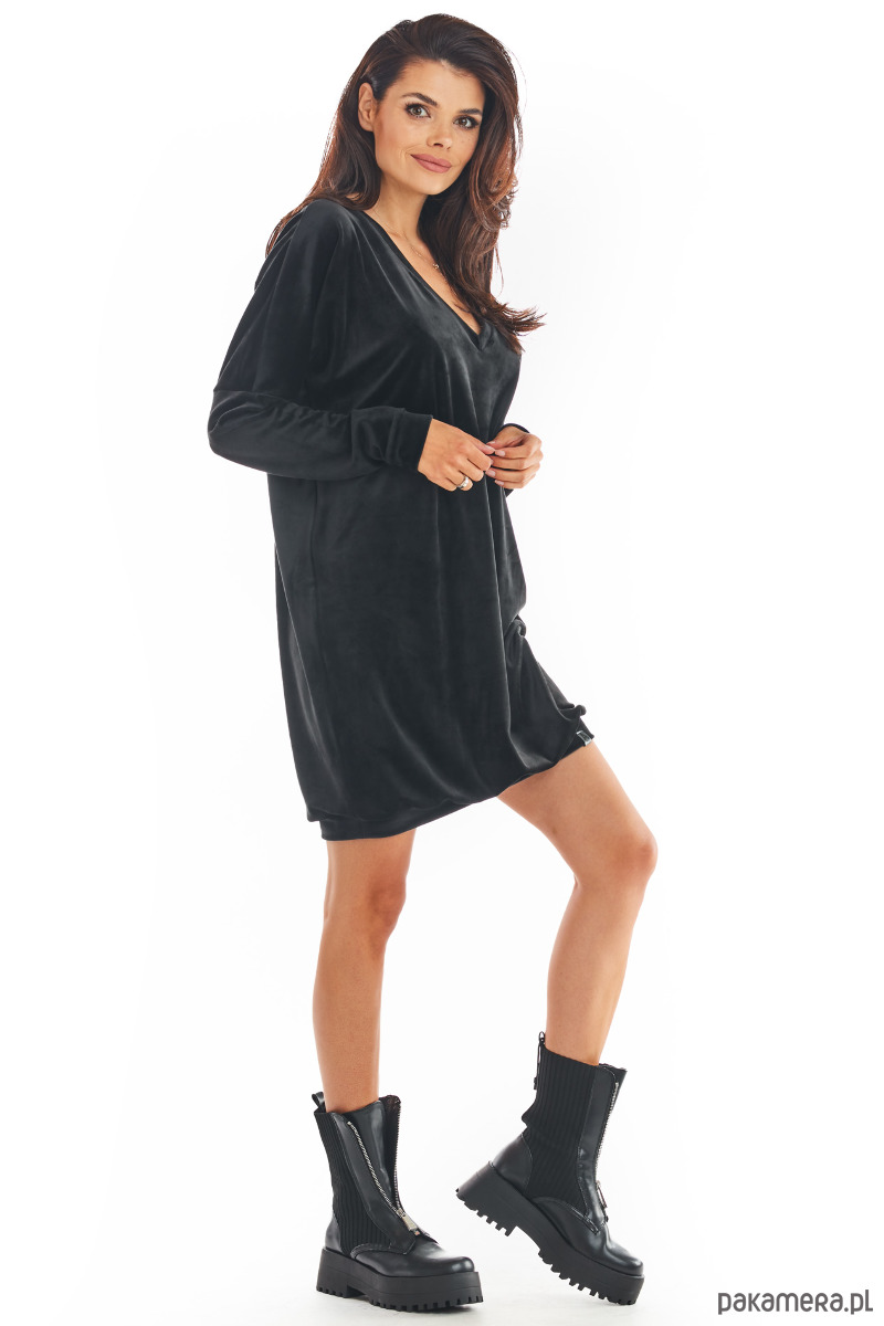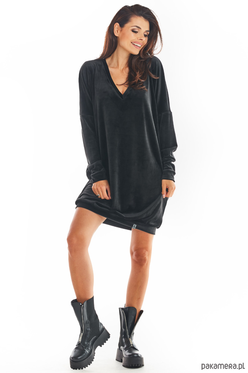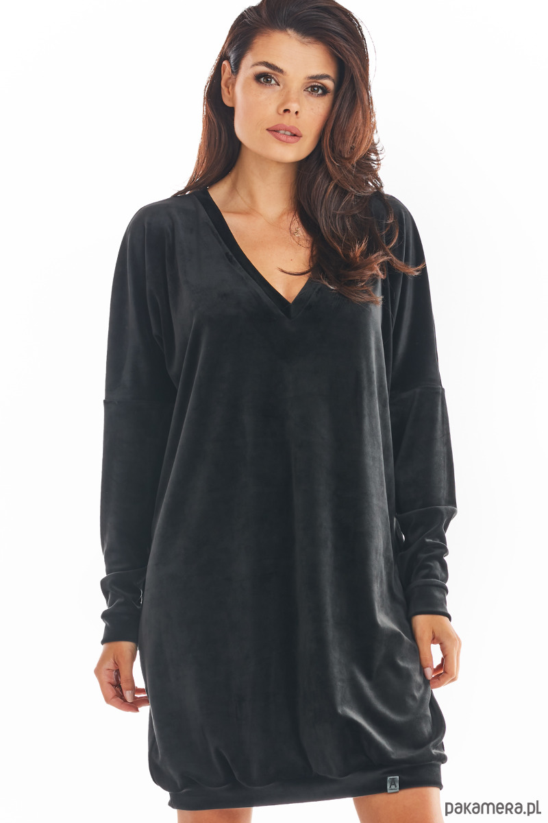 Welurowa, luźna sukienka z długim rękawem i dekoltem w serek, zakończona ściągaczem.