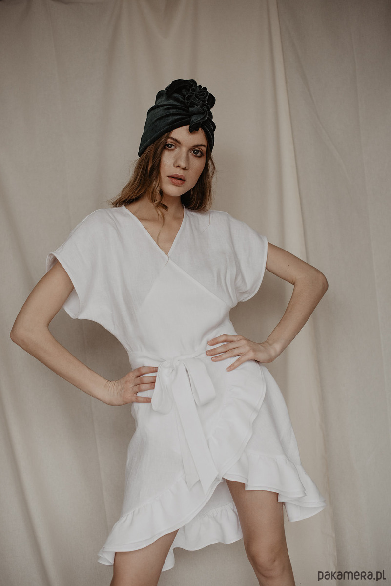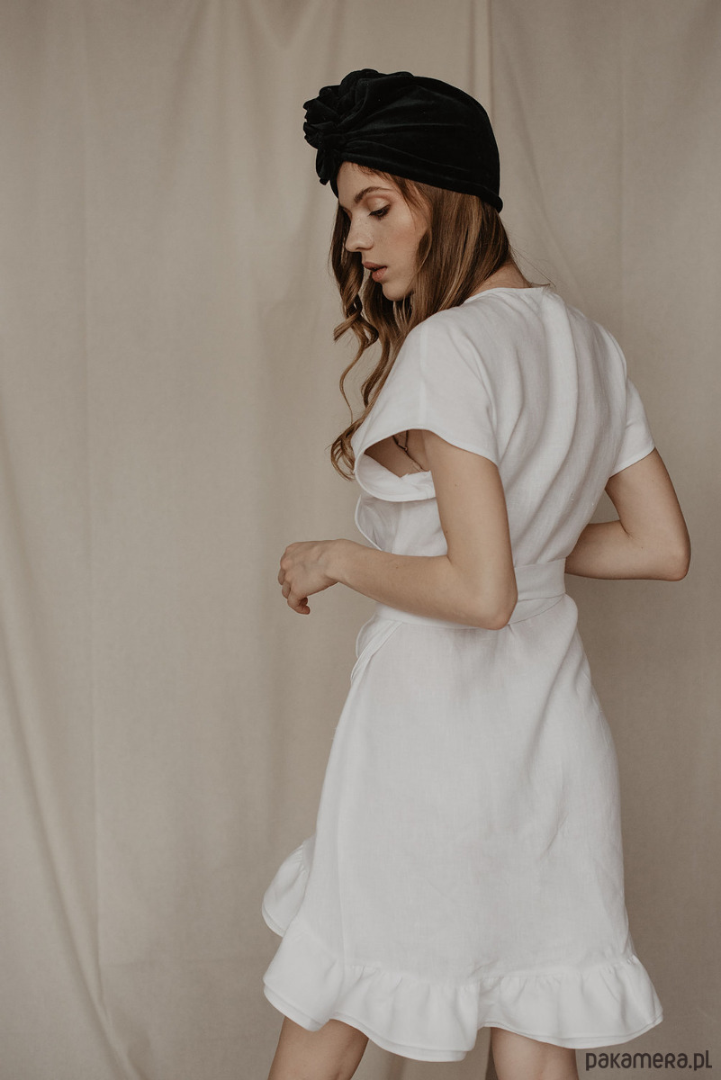 Lniana sukienka z falbanką, wiązana w pasie. Pasuje na rozmiar XS-S-M.