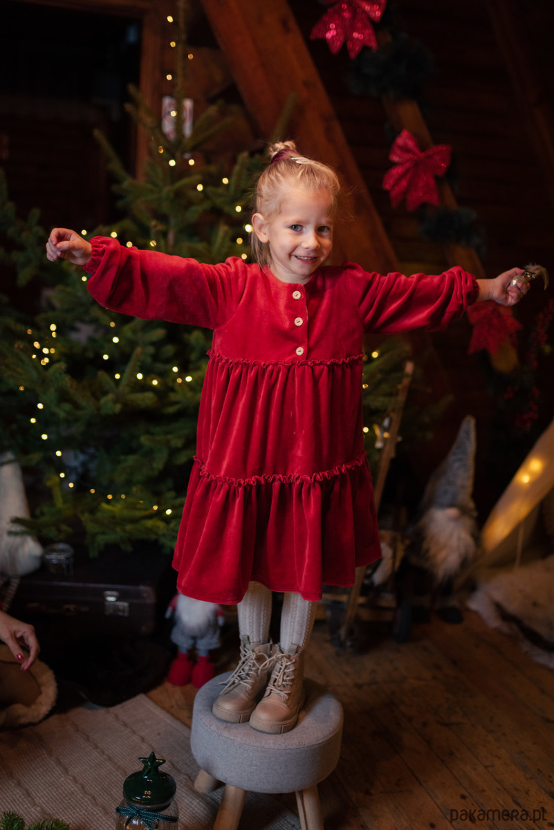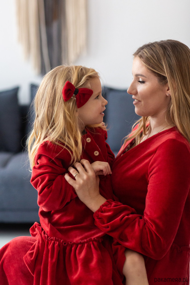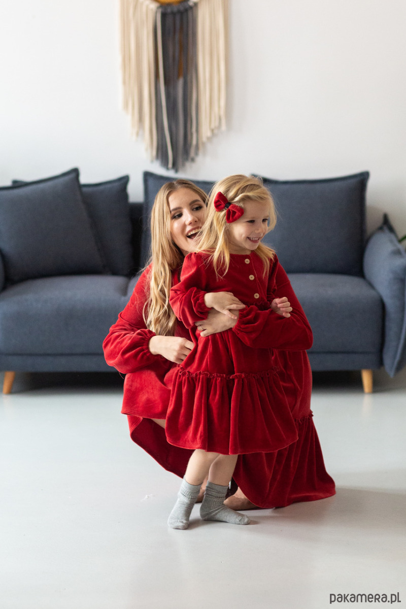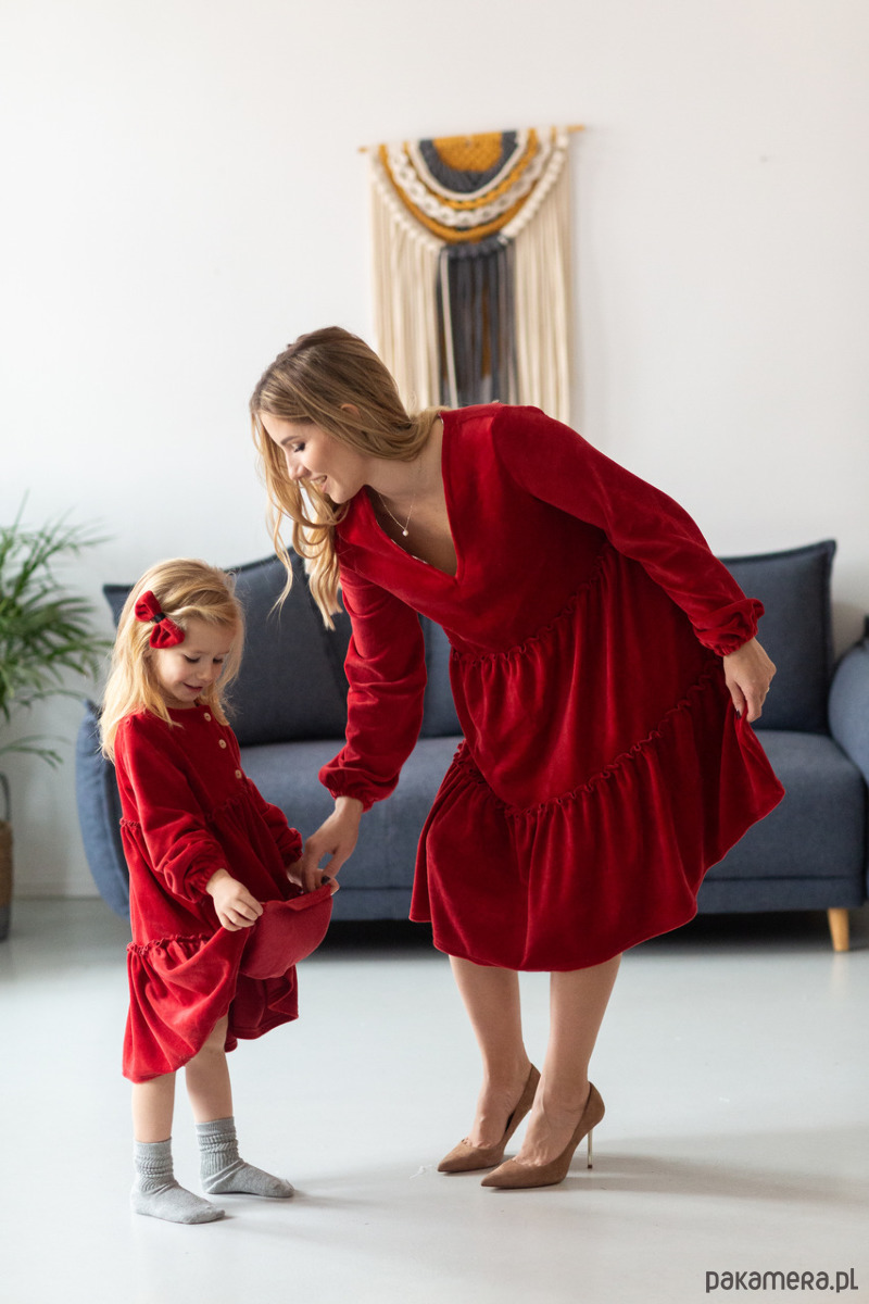 Wykonana z bawełnianego weluru, mięciutki, cieplutki, przyjemny dla skóry. Sukienki wykonane zostały tak aby dawała dziecku swobodę podczas zabawy. Super komfortowe i wygodne. Krój sukienek lekko oversize dla dziecka, dla mamy krój standardowy góra lekko dopasowana (w litere A).