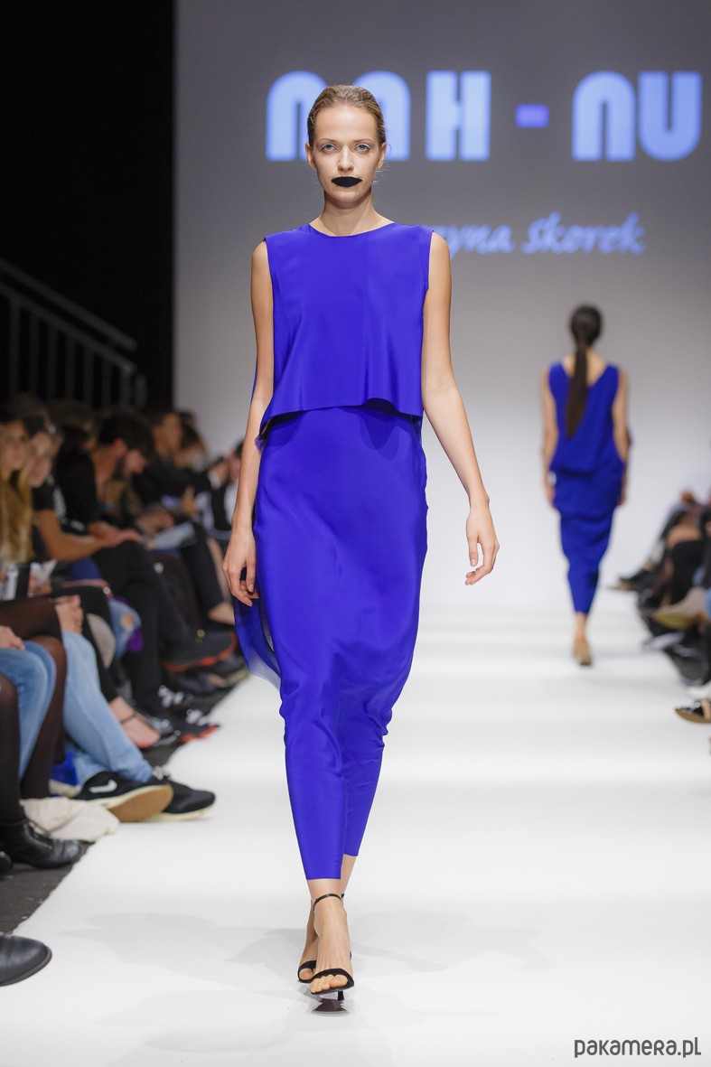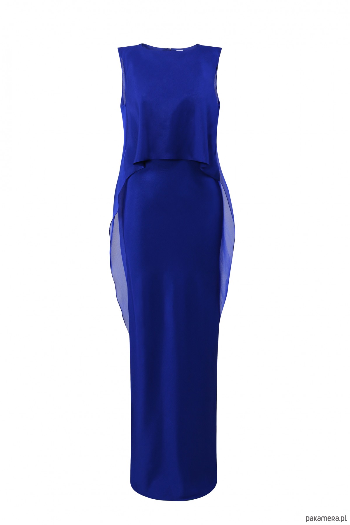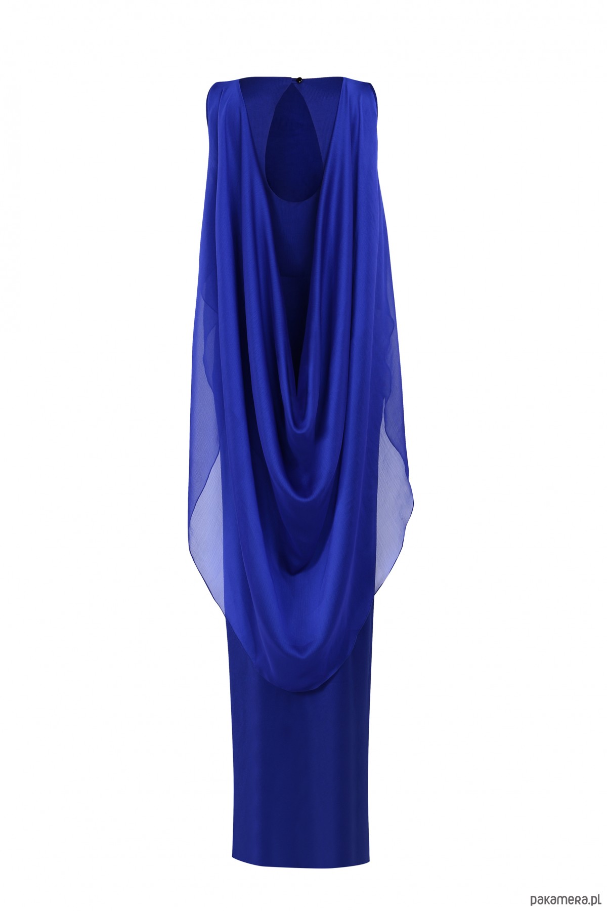 Elegancka wieczorowa suknia w szafirowym kolorze, z oryginalnym wdziankiem i draperią z tyłu. Sukienka idealnie na wyjątkowe, eleganckie wyjścia. Skład: wiskoza 100% ; Kolekcja ILLUSION