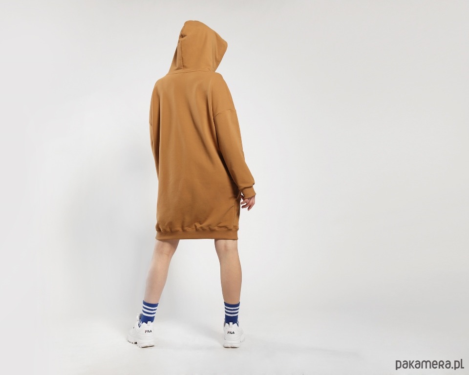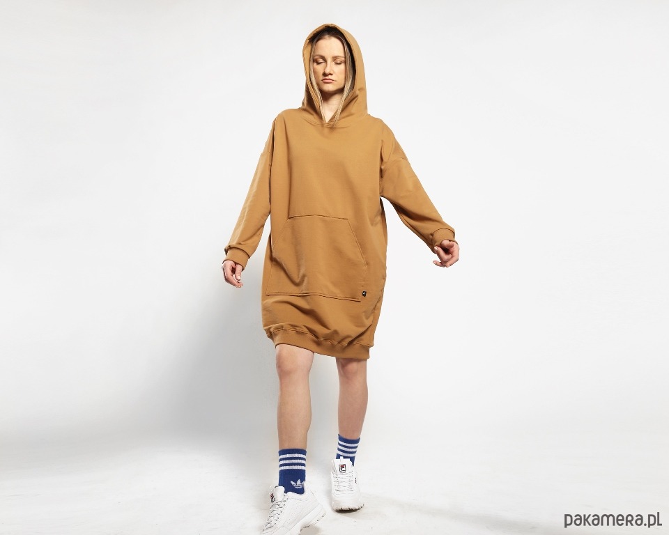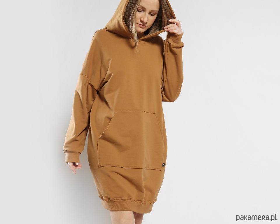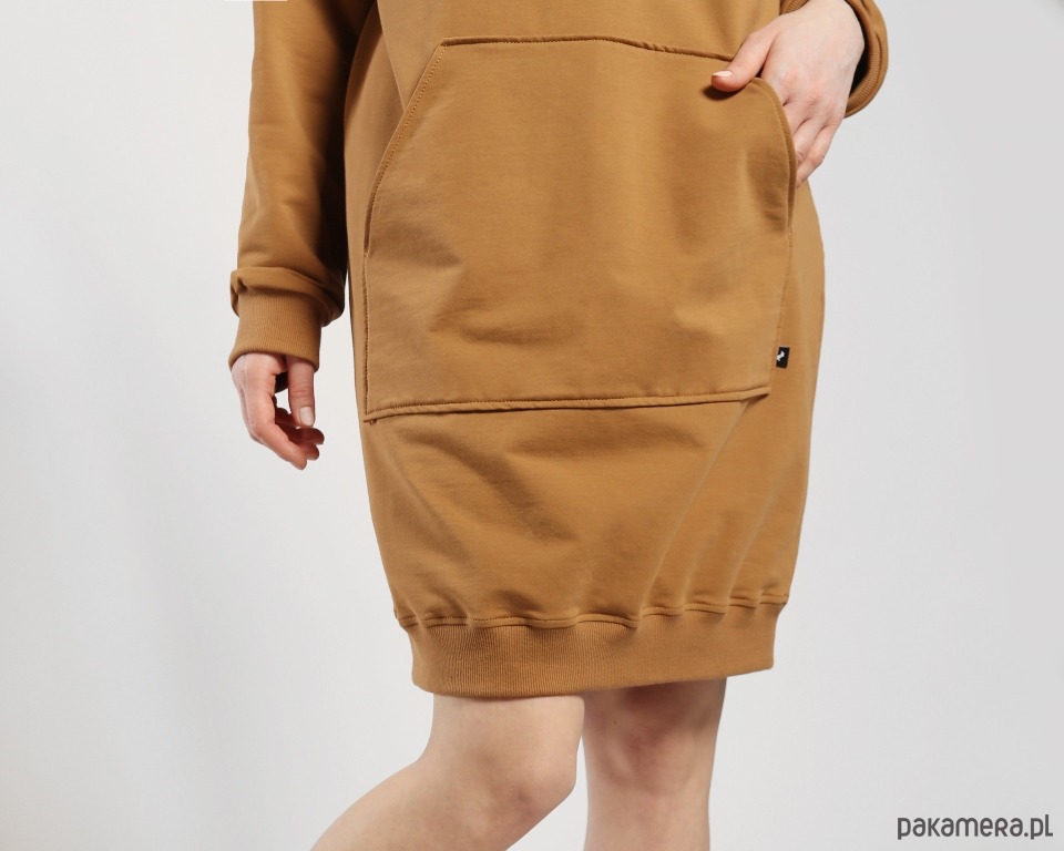 Dzianinowa sukienka w obłędnym cynamonowym kolorze. Obszerna forma, duży kaptur, a z przodu spora kieszeń kangur. Dzięki użyciu wysokogatunkowej dzianiny ubranie jest przyjemne dla skóry i bardzo wygodne. Rękawy i dół bluzy wykończone bawełnianym ściągaczem.