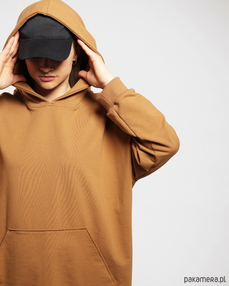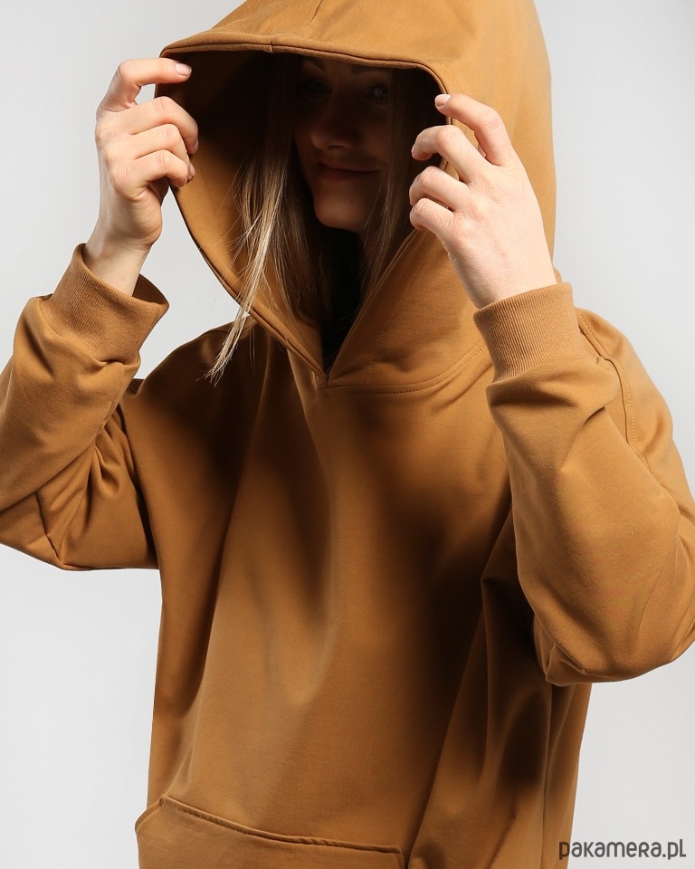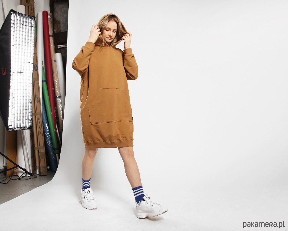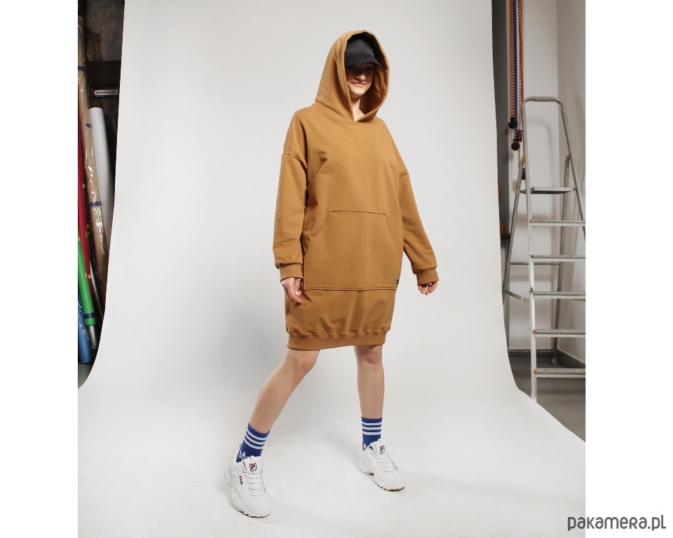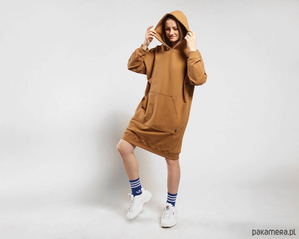 Dzianinowa sukienka w obłędnym cynamonowym kolorze. Obszerna forma, duży kaptur, a z przodu spora kieszeń kangur. Dzięki użyciu wysokogatunkowej dzianiny ubranie jest przyjemne dla skóry i bardzo wygodne. Rękawy i dół bluzy wykończone bawełnianym ściągaczem.