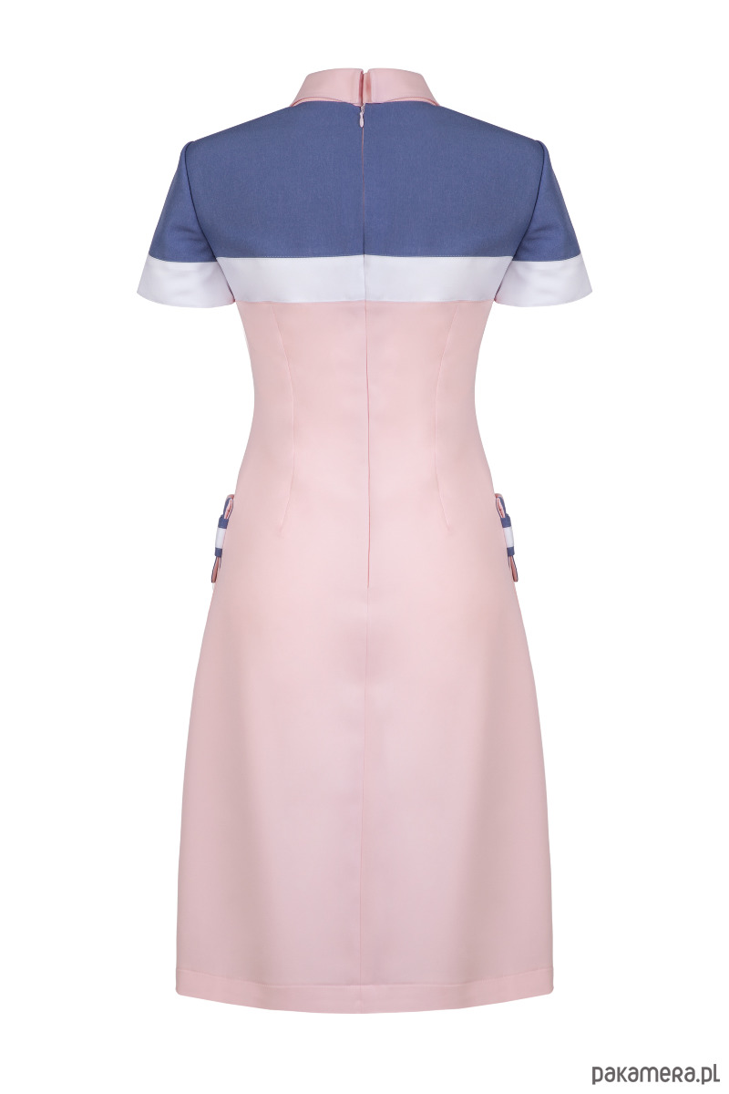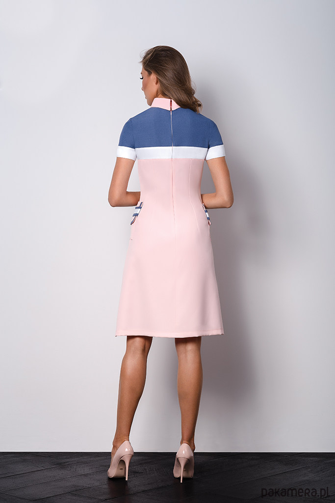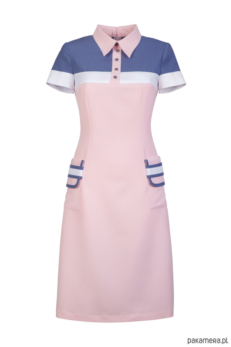 Różowa sukienka z kołnierzykiem z lekko podniesioną talią podkreśla i wysmukla kobiecą sylwetkę, a dzięki ozdobnym kieszeniom w subtelny sposób odsłania atuty kobiecego ciała. Połączenie koloru niebieskiego z białym i różowym daje szerokie możliwości w doborze dodatków i akcesoriów, dzięki czemu zakup przestaje być zakupem „na jeden raz”. Sukienkę można nosić wraz z butami na wysokim obcasie, jak również do butów sportowych.