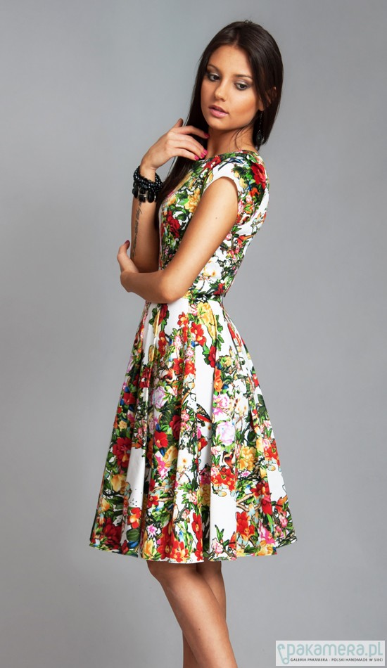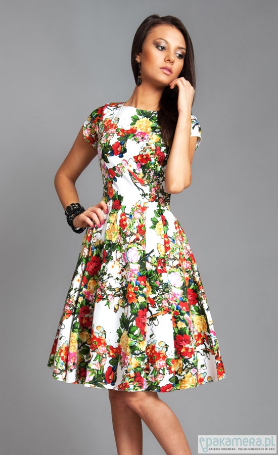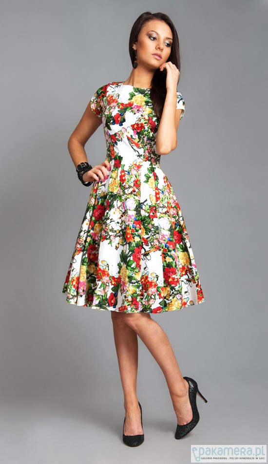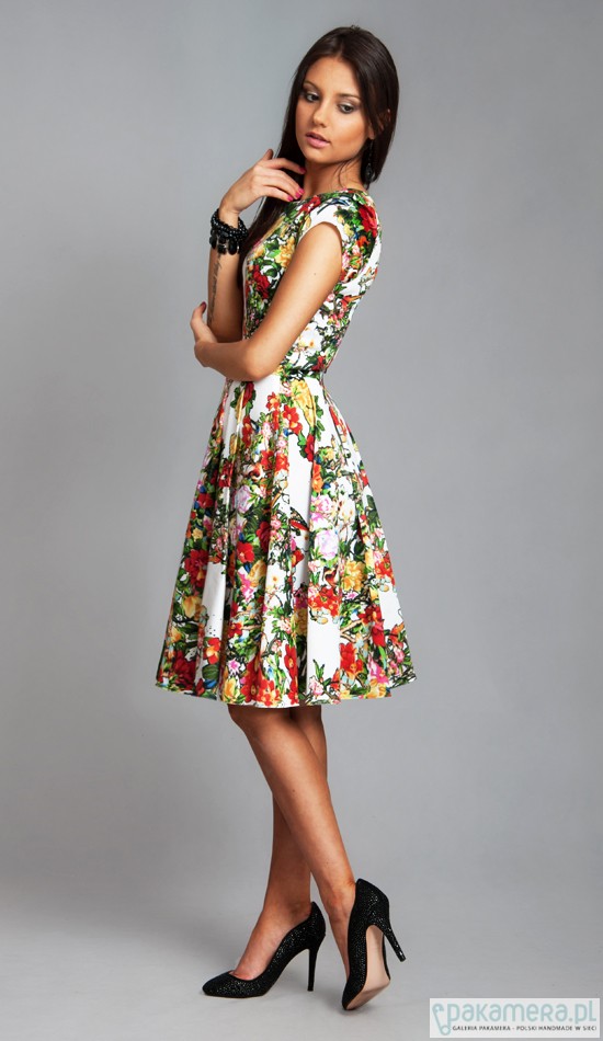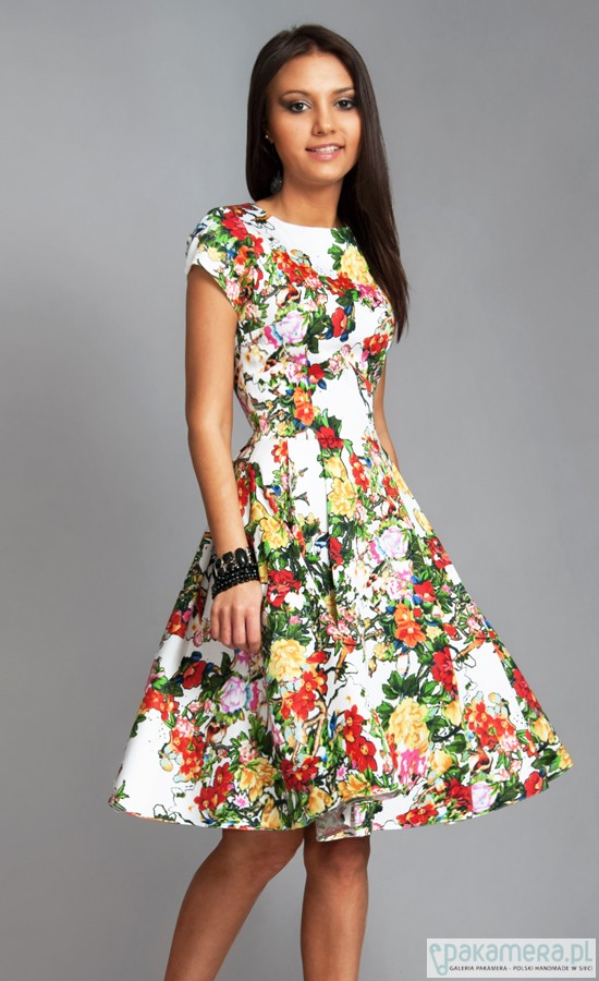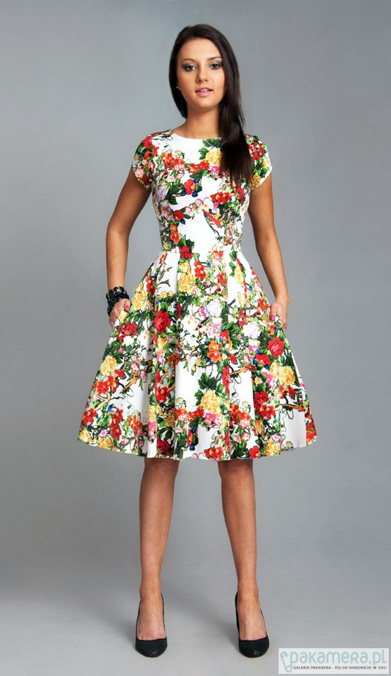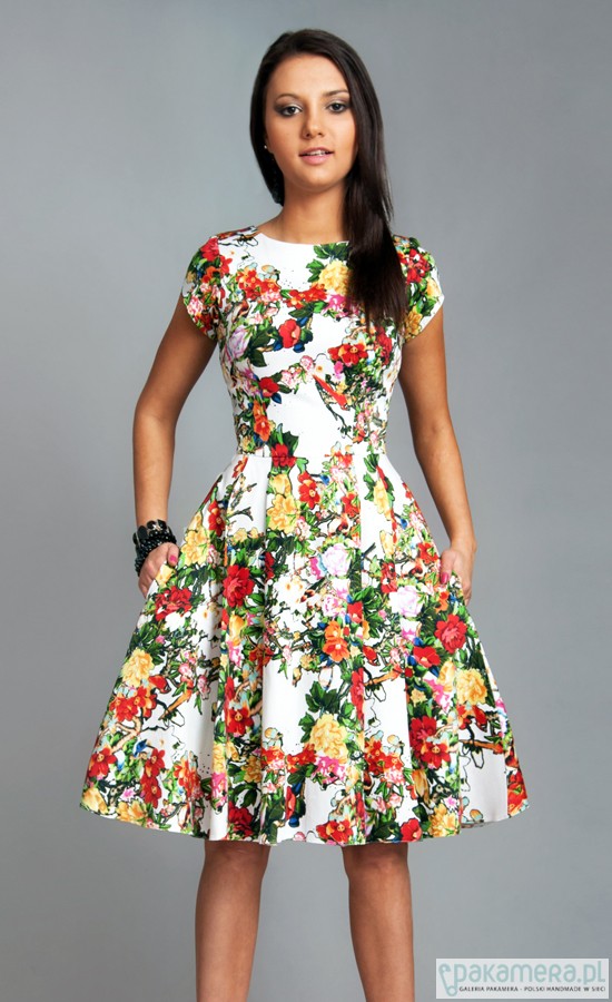 Sukienka uszyta jest z doskonałej jakości, miłej w dotyku, tkaniny z domieszką lycry. Sukienka ma kobiecy fason, z dopasowaną talią i rozkloszowanym dołem. Sukienka posiada wygodne kieszenie. PRODUKT POLSKI