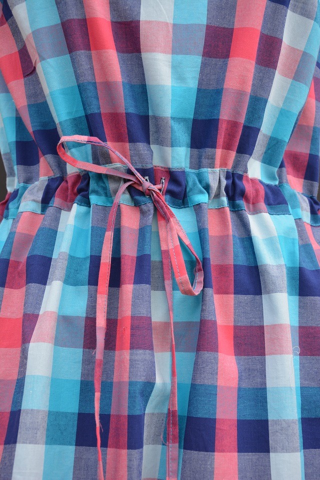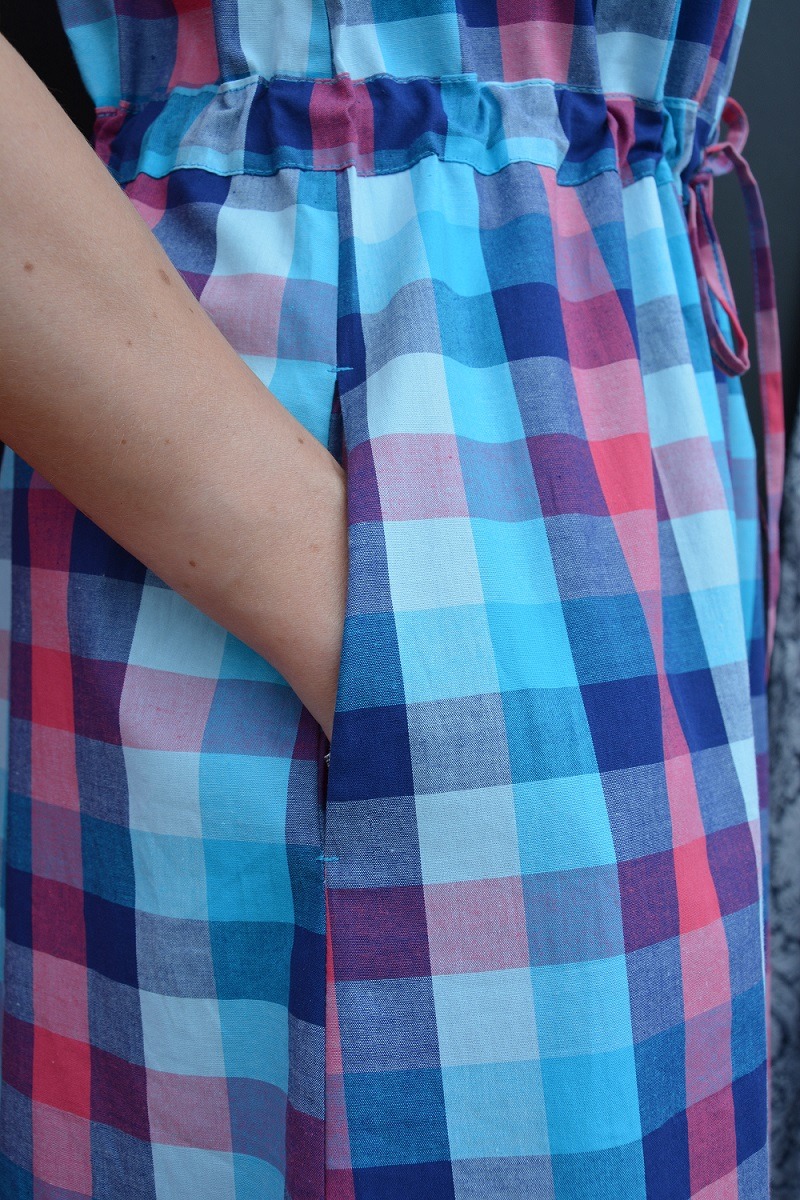 Letnia sukienka w kratkę w odcieniach niebieskiego oraz różu. Sukienka posiada ściągacz w tali oraz kieszenie