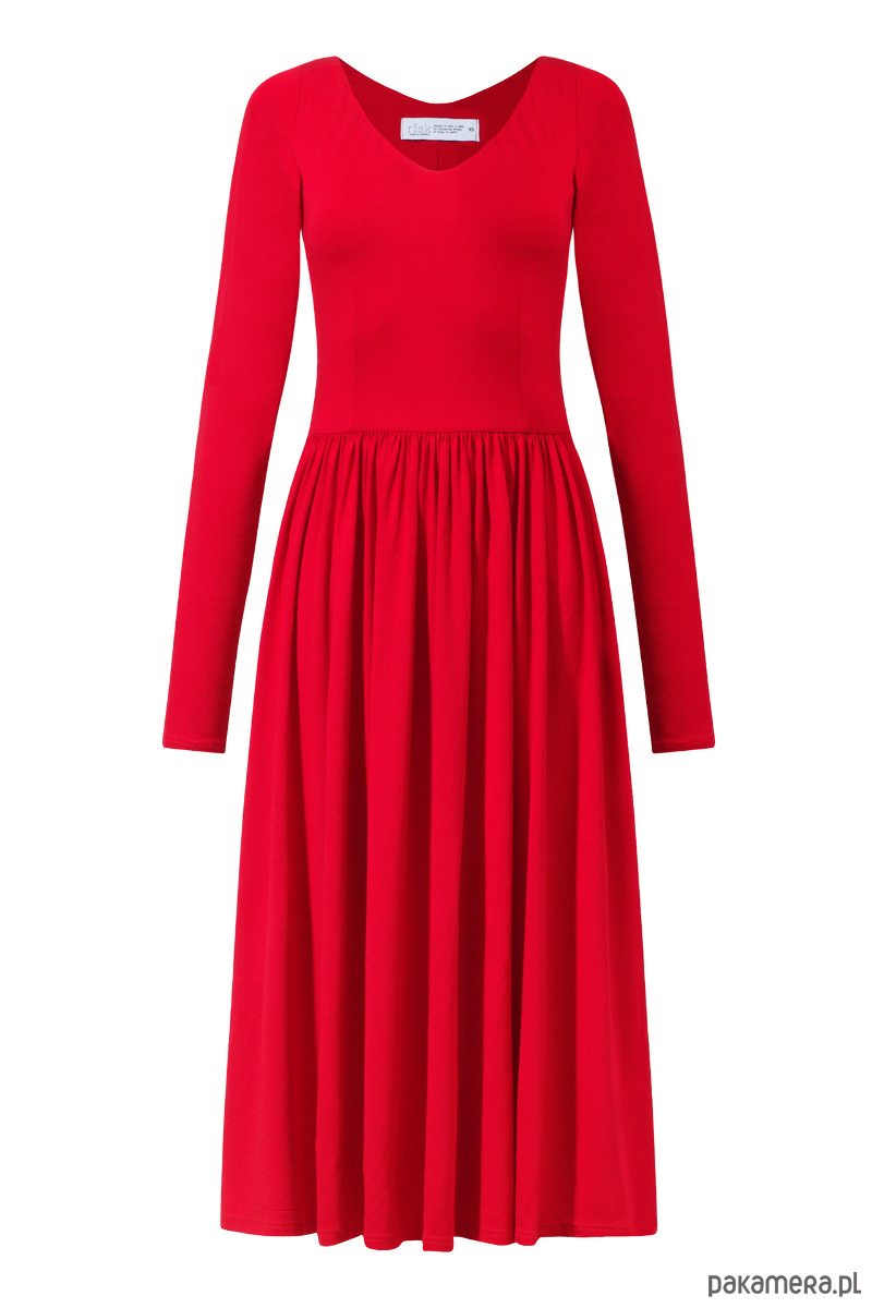Sukienka- marzenie i to nie tylko nasze - odkąd pojawiła się na zdjęciu, wciąż słyszałyśmy pytanie „kiedy będzie?". Bo sugestie, by uszyć zasłaniającą kolana, dopasowaną w talii (ale miękko układającą się na biodrach), z dłuższym rękawem, ale rozległym kobiecym dekoltem sukienkę padały tak często, że mnóstwo kobiet może czuć się współautorkami projektu. Oto jest – wygodna, zmysłowa i soczyście czerwona. Chcemy, by spełnione marzenia zawsze wyglądały tak sexy.