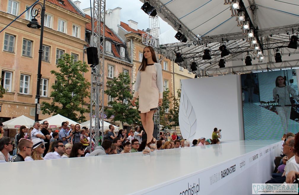 Sukienka wiosna/lato brzoskwiniowo-beżowa z rękawami z podszytego białego szyfonu z plisami przy dekolcie. Zapinana z tyłu na kryty suwak. Zarówno dekolt jak i owalny dół sukienki wykończonym materiałem typu punching w kolorze czekoladowego brązu. EVA GRYGO Limited edition | Laureat New Look Design podczas Warsaw Fashion Street 2013 | Pokaz kolekcji podczas TOP MODEL UK 2013 w Londynie. Skład: 30% szyfon, 50% Morizon, 10% Mexa Twill, 10% Skóra ekologiczna