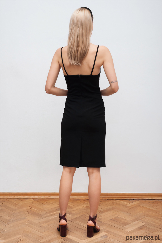 Sukienka ołówkowa przed kolano z głębokim dekoltem na cienkich ramiączkach.