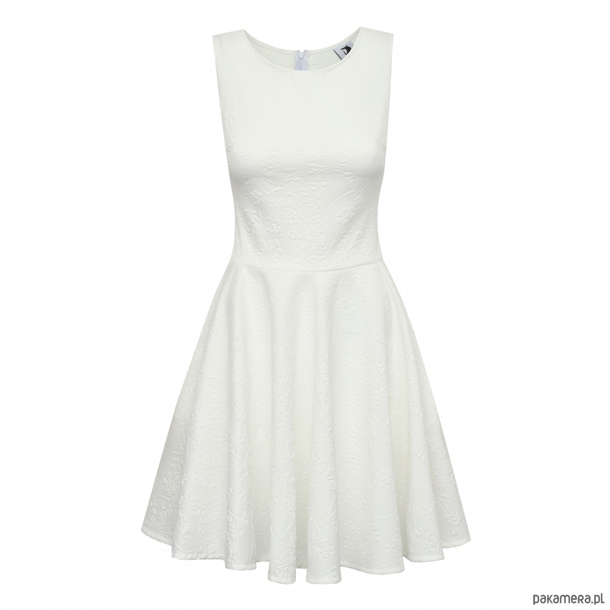 Biała sukienka bez rękawów z zaszewkami piersiowymi i zapinanym na zamek tyłem. Wykonana z wysokiej jakości wytłaczanego materiału. Modelka ma na sobie rozmiar: XS / Wzrost modelki: 180 cm / Pranie: 30°C / Skład: 100% poliester
