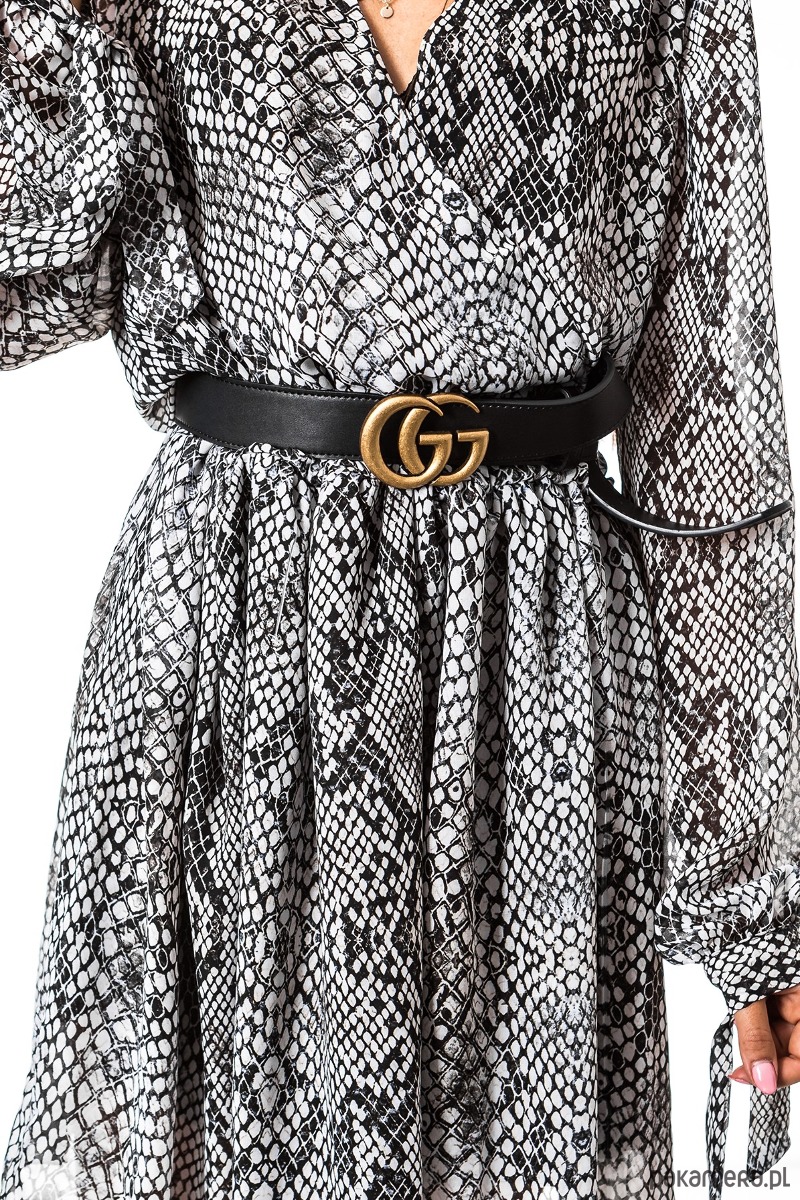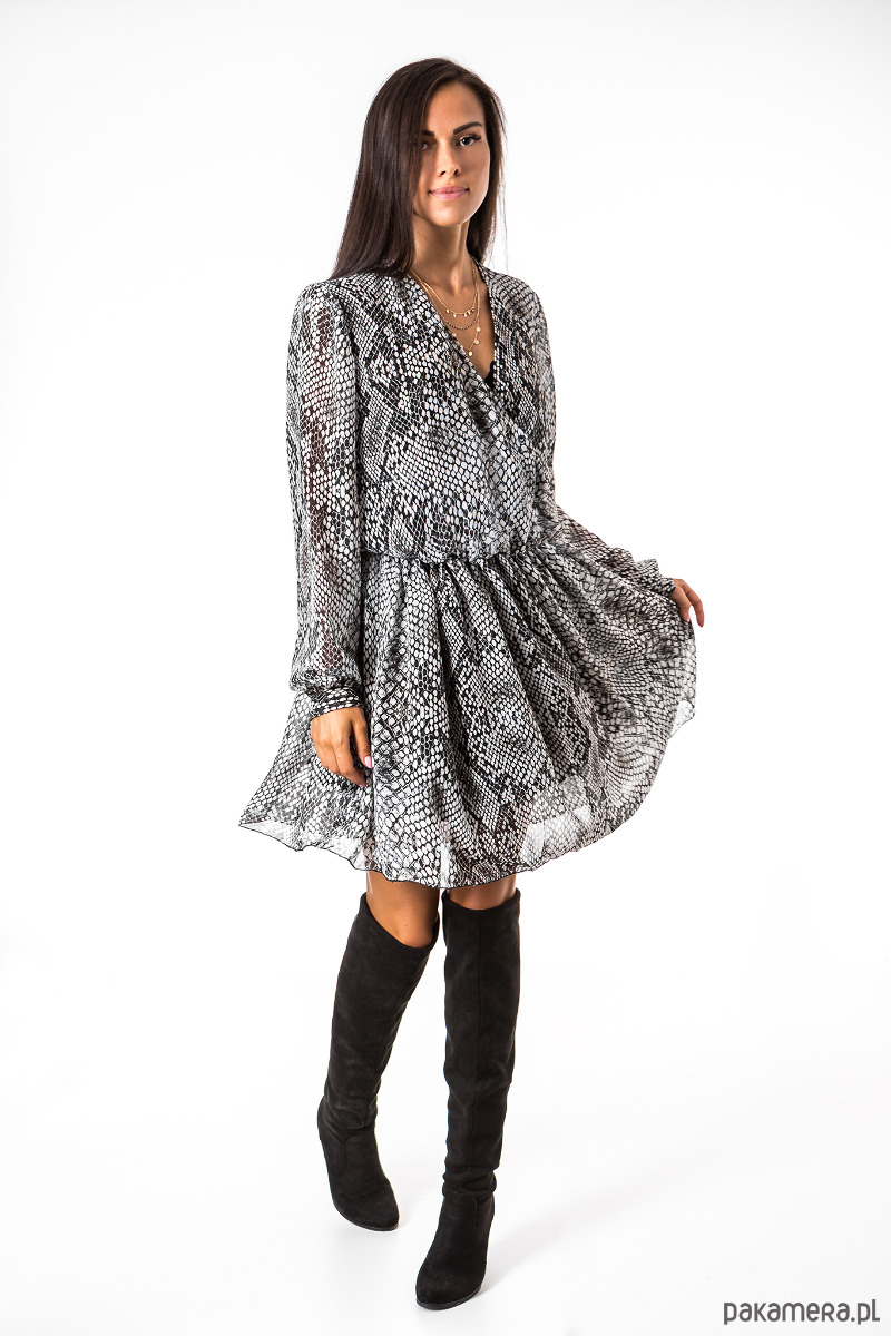 Niezwykle modna sukienka w print skóry węża. Wykonana ze zwiewnego szyfonu, podszyta podszewką. Kolorystyka utrzymana w odcieniach szarości idealnie wpisze się w aktualne trendy w modzie. Niezwykle kobieca. W pasie wszyta gumka, przez co można regulować jej długość. Długi rękaw- zakończony ozdobną kokardką do związania. Kopertowy dekolt. Wykonana z dbałością o każdy szczegół.
