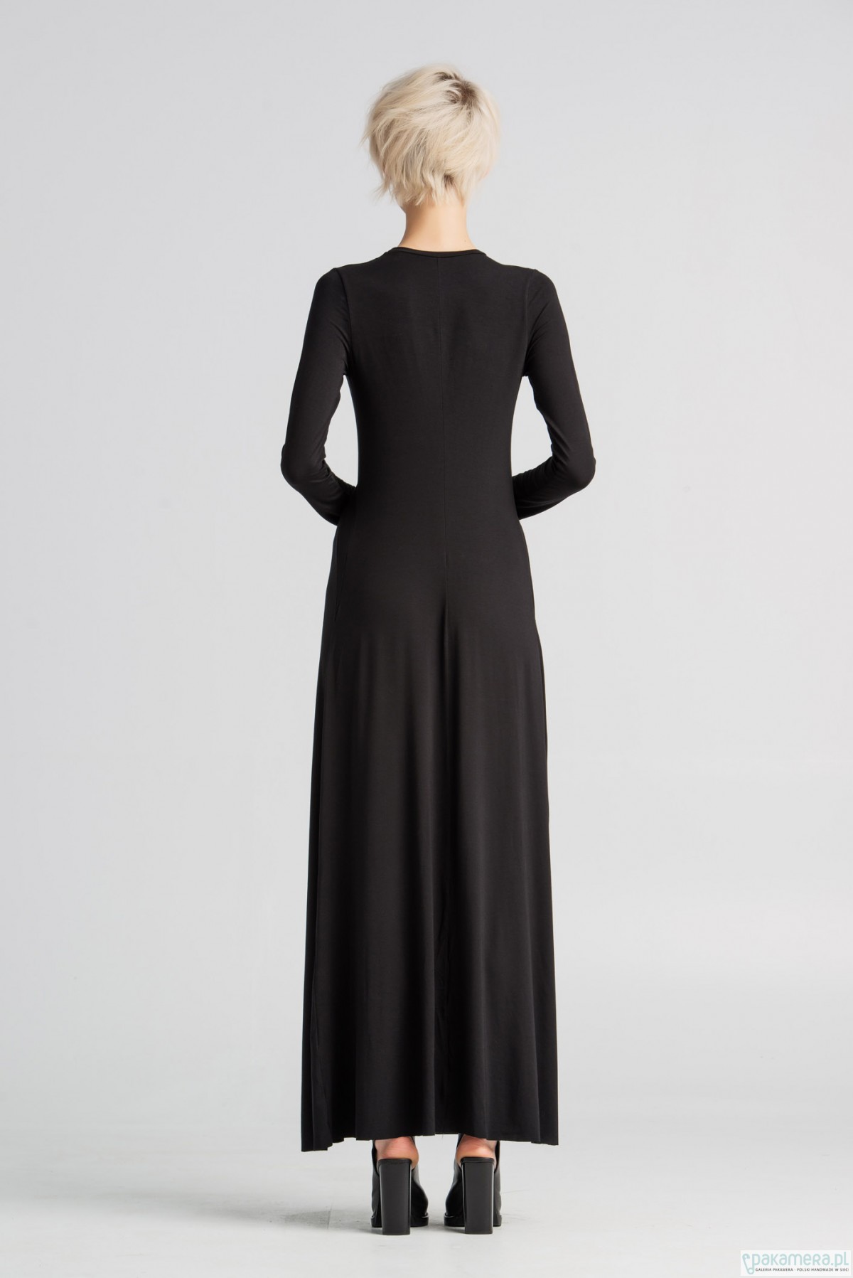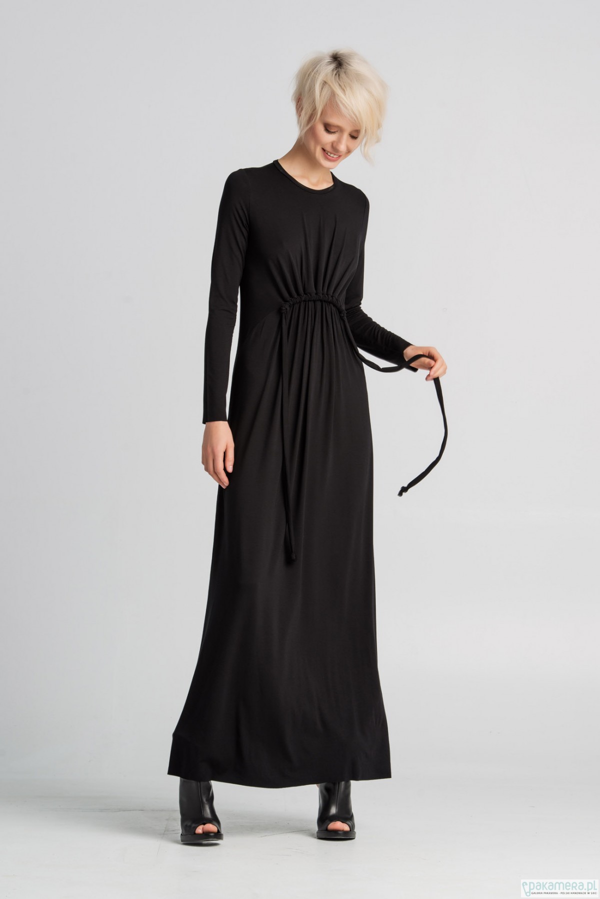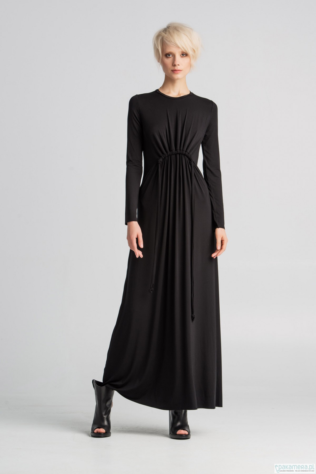 Długa suknia w stylu boho. - Forma lekko rozkloszowana - Z przodu tunel z ozdobnym sznurkiem do regulacji obwodu . Po ściągnięciu tworzy ozdobne drapowania - Bez podszewki - Dekolt pół okrągły - Długość sukienki 150 cm - Długość rękawa 60 cm - Kolor czarny Z czym nosić? : Jeśli lubisz styl boho dodaj futrzaną kamizelkę, kapelusz z szerokim rondem i kozaki na koturnie . Wolisz coś w bardziej rockowym klimacie? Dodaj skórzaną kurtkę , trampki i dzianinową tubę. materiał : dżersey skład: wiskoza 93% lycra 7 % sposób prania : pranie w pralce do 40 st , suszyć na leżąco , zalecane prasowanie na lewej stronie do 110 st kolekcja : jesień - zima Modelka ma 178 cm wzrostu i ma na sobie sukienkę w rozmiarze 34 Termin realizacji: 7-10 dni