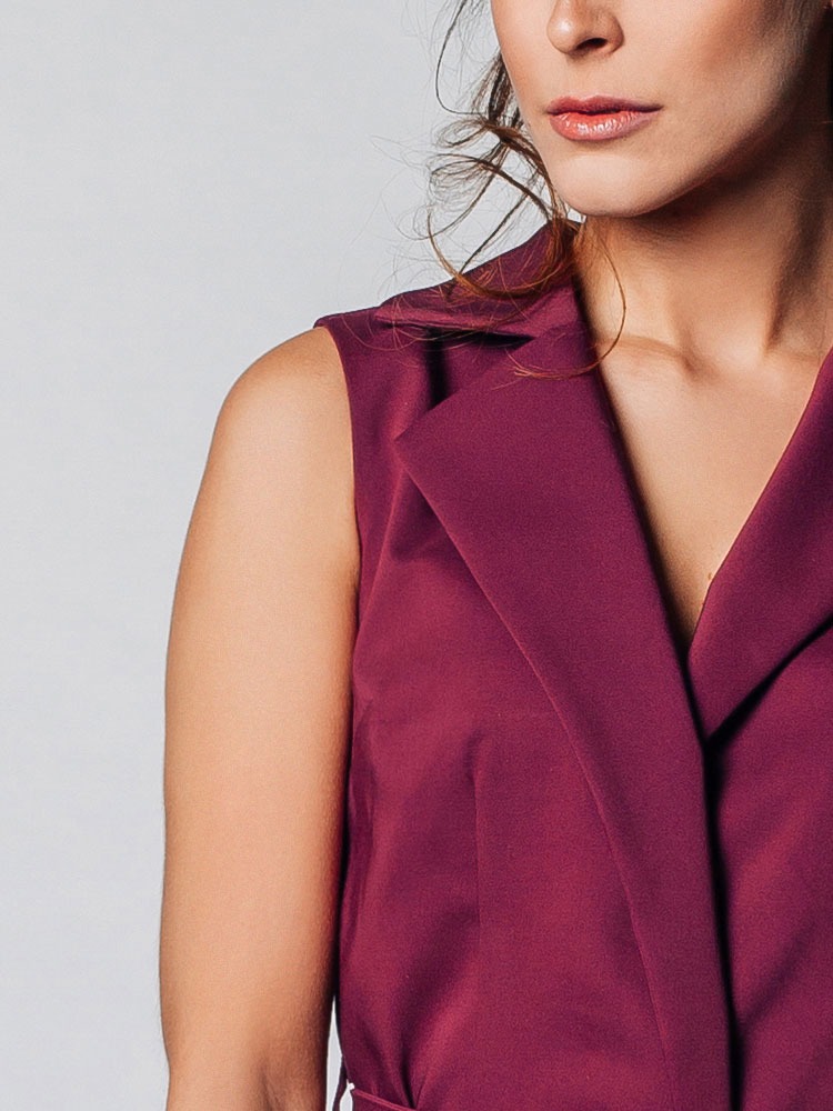 Sukienka kopertowa z eleganckimi klapami w kolorze bordowym. Kopertowy fason to elegancki wybór na wiele okazji. Pasuje do wielu sylwetek. Sukienka została podszyta bawełnianą, oddychającą podszewką w kolorze tkaniny. W tali zapinana jest guzik wewnętrzny oraz wiązany pasek z zewnątrz. Ten fason to nasz bestseller na wesela i komunie.