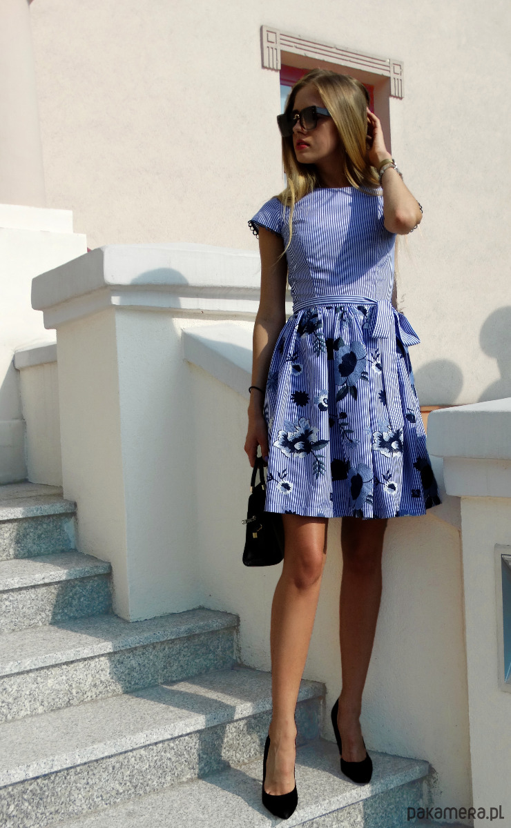 W całości sukienka jest w granatowo-białe paski. Natomiast dół dodatkowo zdobiony jest pięknymi, haftowanymi kwiatami w kolorze granatowym ,szarości i khaki. Rękawki wykończone ozdobną, sznurkową koronką.