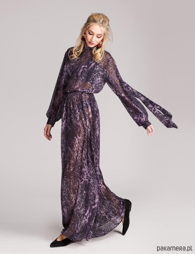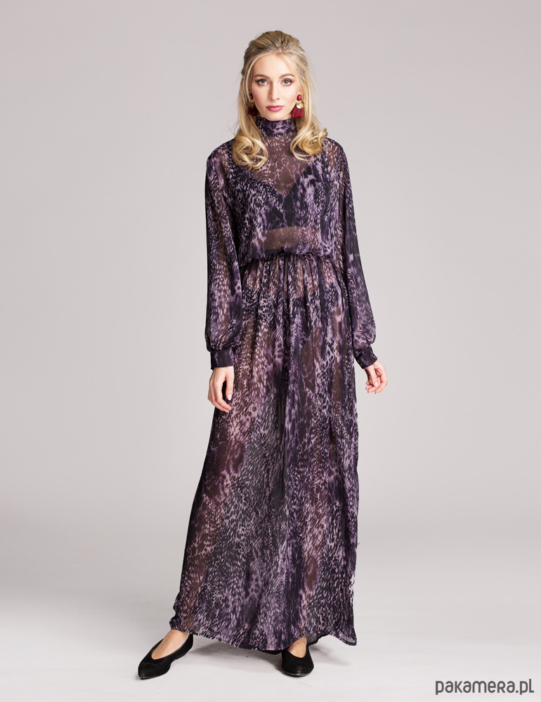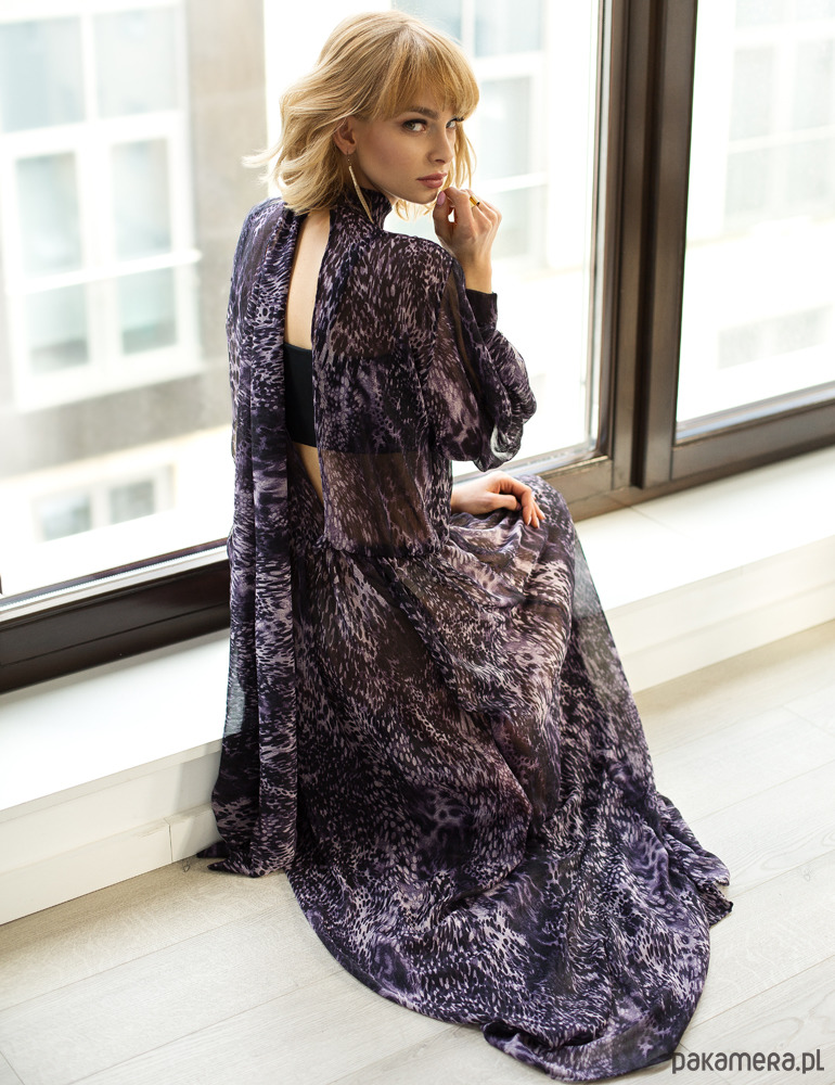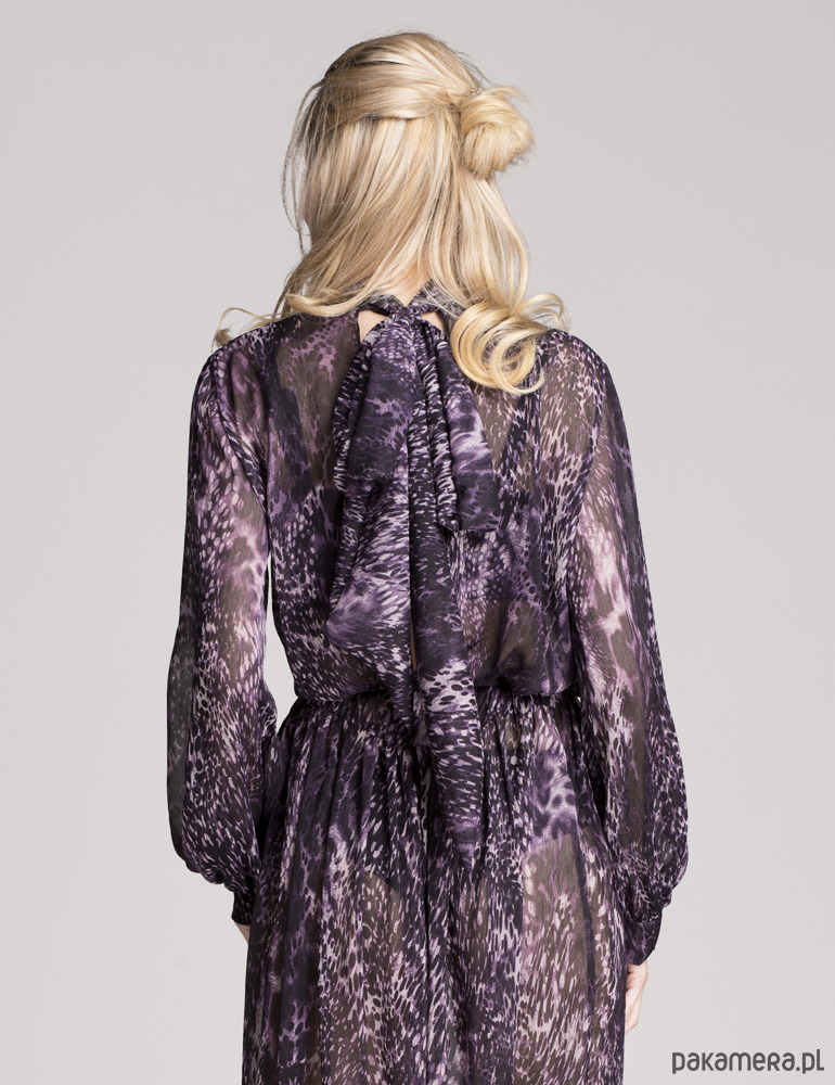 Luźna, bogato marszczona w pasie, wkładana przez głowę, dekolt wykończony stójką, która z tyłu przechodzi w długie szarfy dające wiele możliwości wiązania, rękawy rozszerzane do dołu, marszczone przy mankiecie, z tyłu pęknięcie na plecach do pasa, bez podszewki. Uszyta z miękkiego, lekko kreszowanego, półprzezroczystego szyfonu w oryginalny zwierzęcy motyw. Bez podszewki.