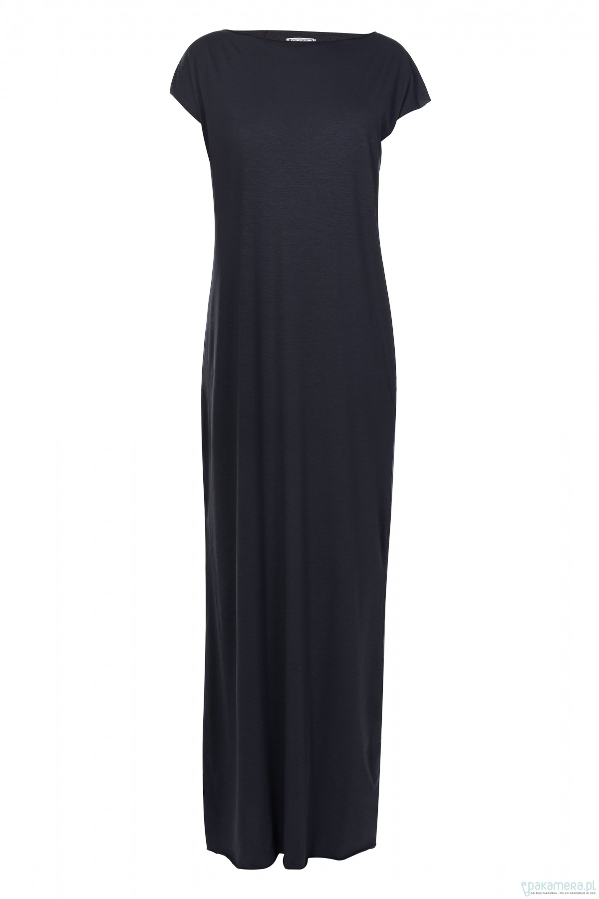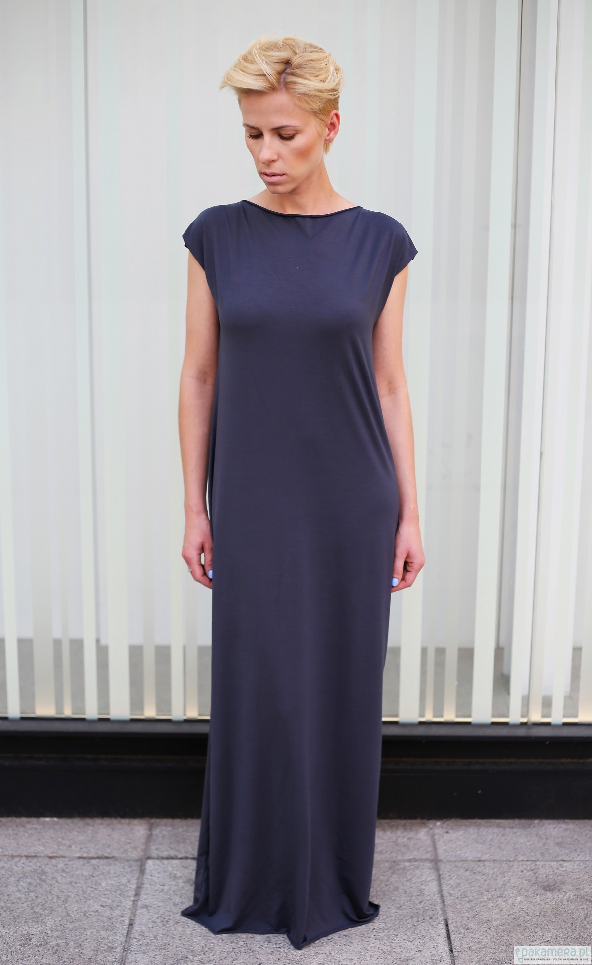 Prosta, klasyczna, długa sukienka, zakończona surowym cięciem. Za pomocą zastosowania paska na wysokości talii można całkowicie odmienić jej charakter i długość. Sukienka wykonana jest z świetnie dopasowującej się do ciała dzianiny. Modelki na zdjęciach mają 166cm, rozmiar sukienki S. Sukienka jest dostępna w rozmiarach S i M Wymiary: S - długość całkowita 145 cm, szerokość w biuście 46, szerokość w biodrach 51 cm, M - długość całkowita 146 cm, szerokość w biuście 48, szerokość w biodrach 53 cm, Skład: 94% wiskoza, 6% elastan