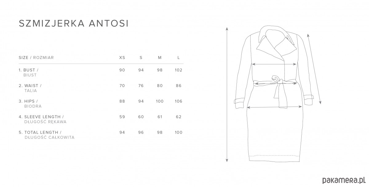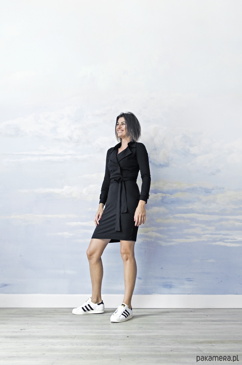 Sukienka, która powstała z zamiłowania do dwóch ukochanych fasonów, co zawsze dobrze działają na figurę - szmizjerki i spódnicy ołóweczka. Koszulowy dekolt ma dużo lekkości i korzystnie eksponuje biust każdej wielkości, ale dół jest bez rozcięcia więc na stałe ładnie modeluje biodra. Takie historie o kształtowaniu sylwetki kojarzą się z ubraniem sztywnym i tu niespodzianka - sukienka uszyta jest z dzianiny tak miękkiej i elastycznej, że czujesz się swobodnie jak w ulubionej luźnej plażówce.