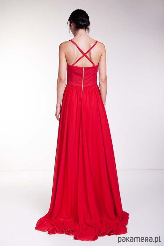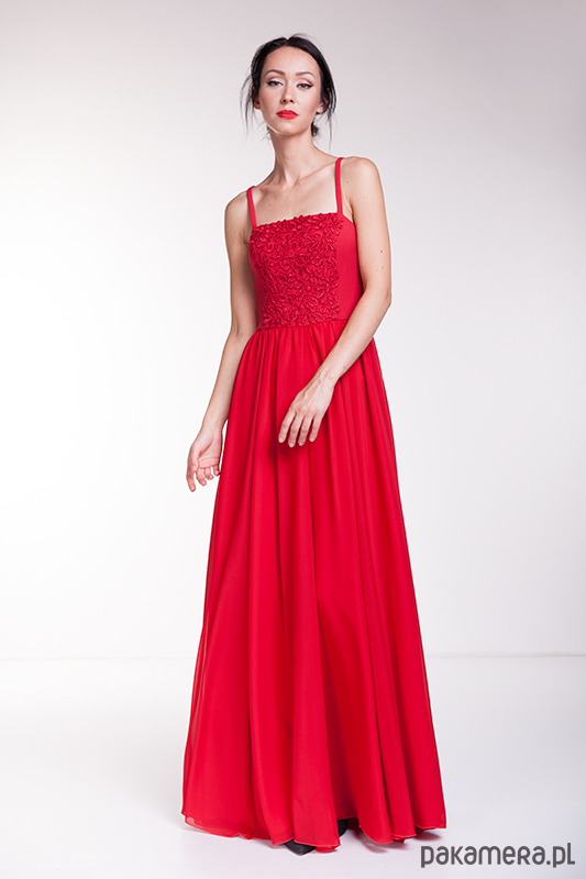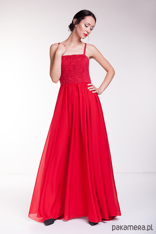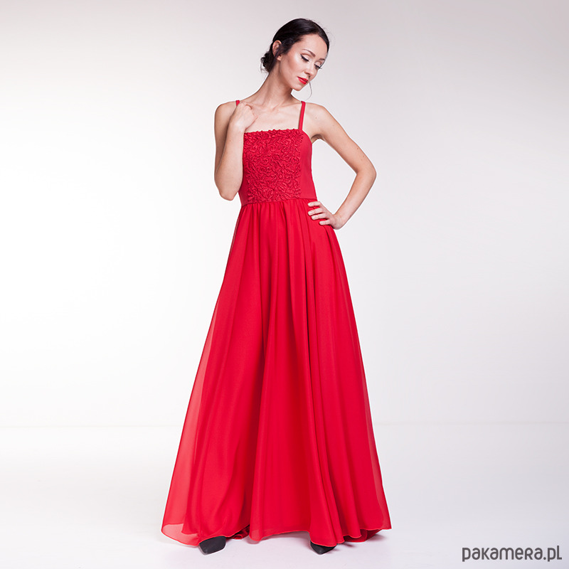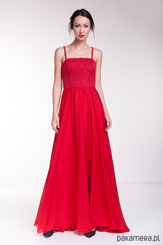 Ekskluzywna suknia wieczorowa uszyta z czerwonego szyfonu, wiskozy i gipiury.