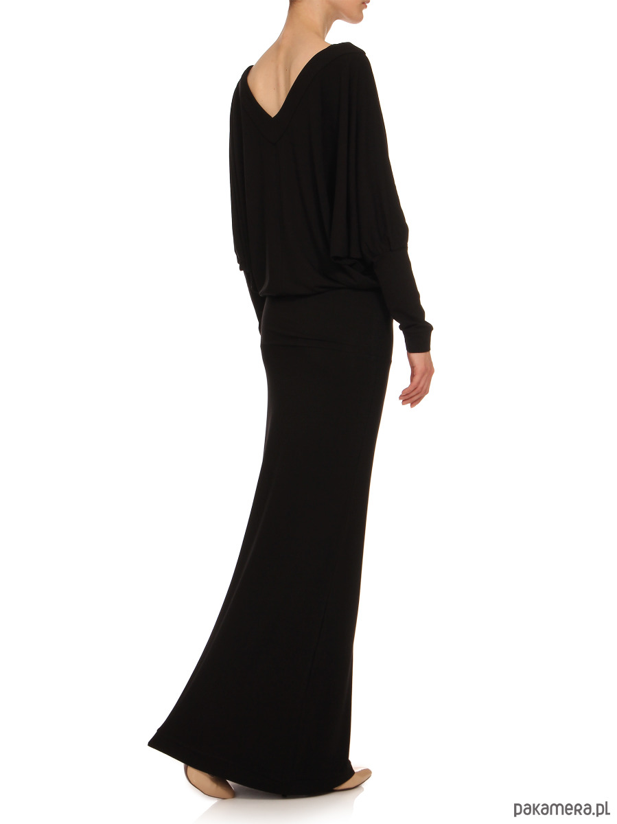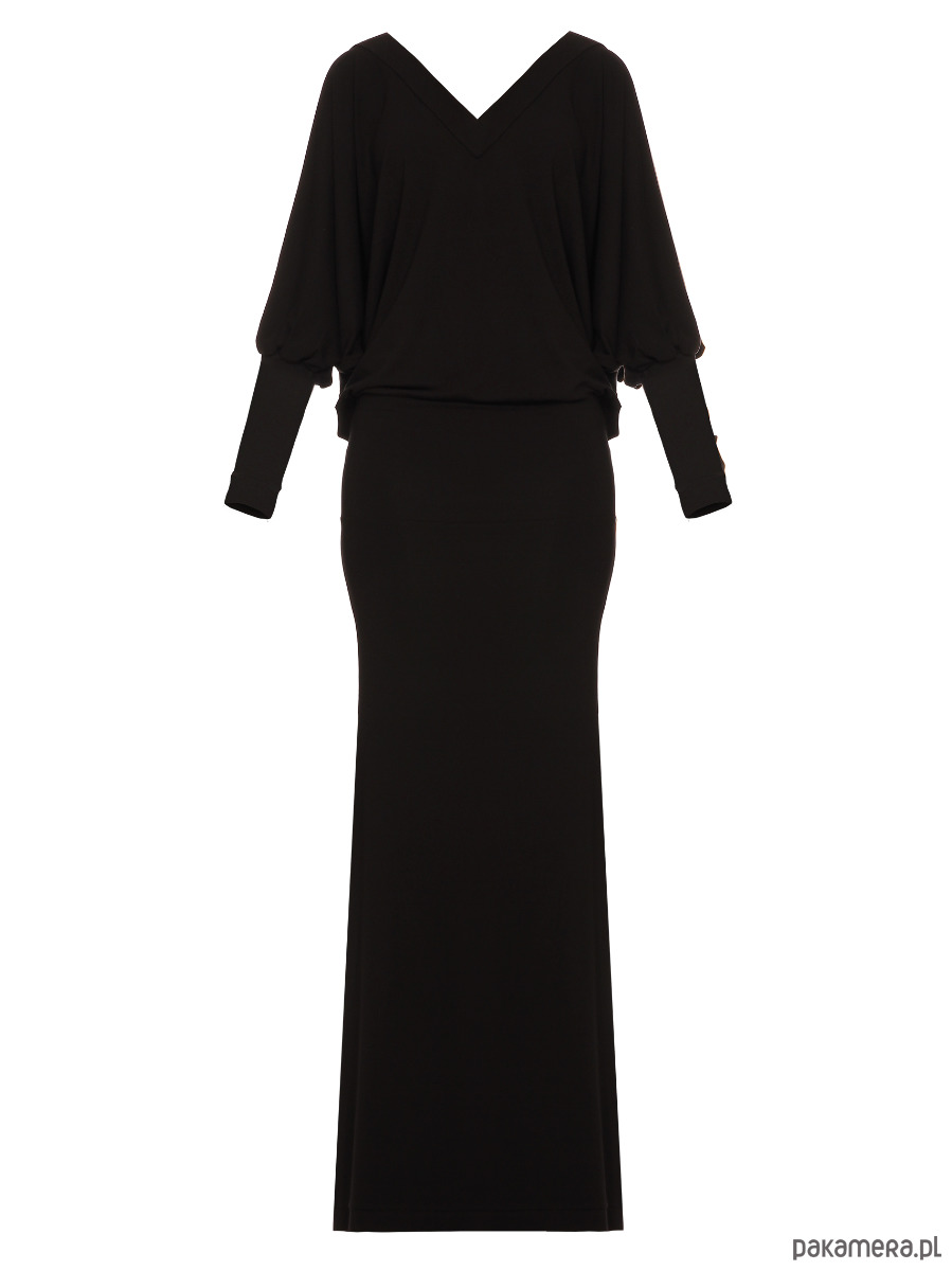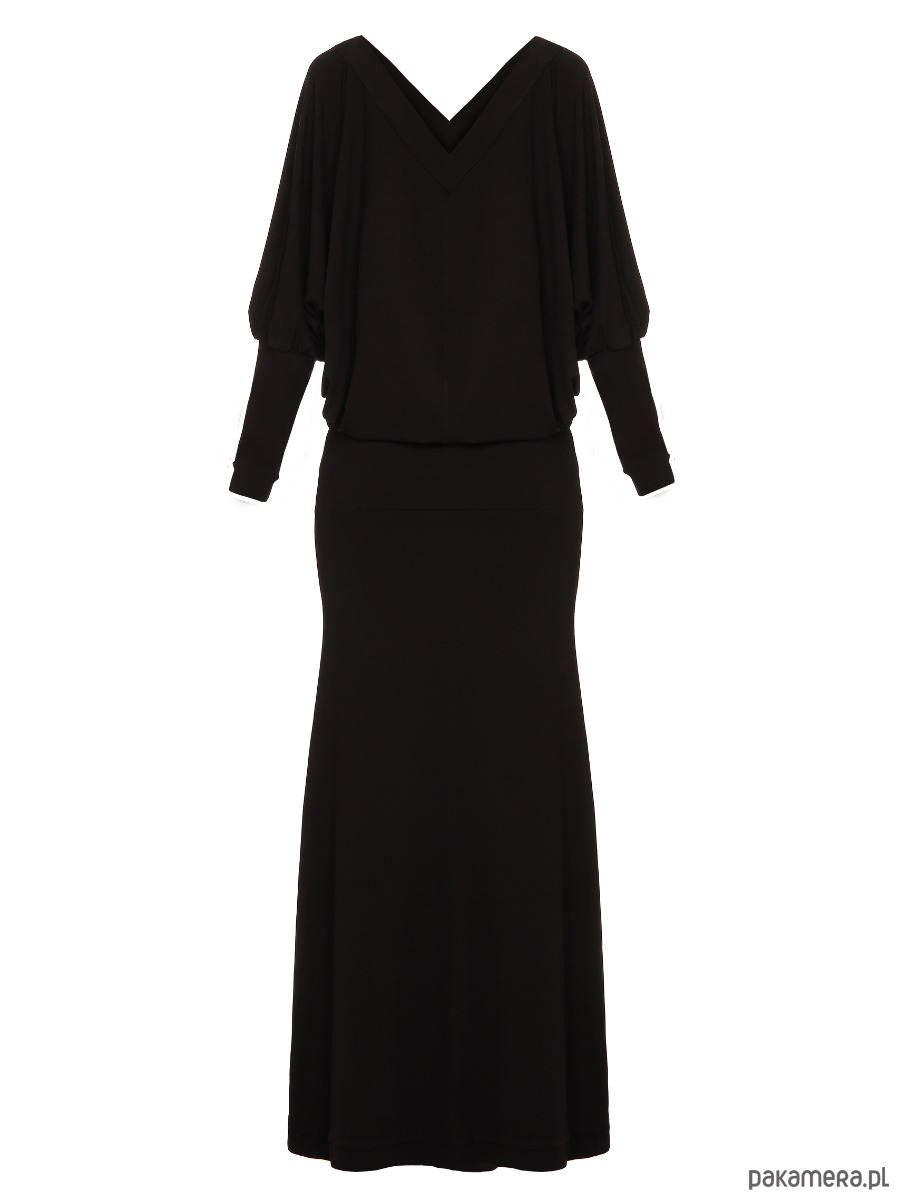 Długa suknia z luźną górą. Kreacja wizytowa, okolicznościowa. Eksponuje dekolt i plecy. Góra luźna i zwiewna; dół delikatnie poszerzany. Dekolt w szpic z przodu; dekolt z tyłu poniżej linii biustonosza. Dopasowana na biodrach. Przymarszczane rękawy typu bufki, zwężane u dołu. Długość rękawów 3/4. Kolor: czarny RAL9005. Wykonana z naturalnej dzianiny wysokiej jakości; tkanina przyjemna dla ciała, przewiewna, rozciągliwa. Długość sukienki ok. 153 cm; długość rękawka ok. 50 cm. Tkanina: 70% wiskoza, 27% poliamid, 3% elastan. Pranie w pralce w temp. 30 stopni; suszenie w stanie rozwieszonym; prasowanie parą.