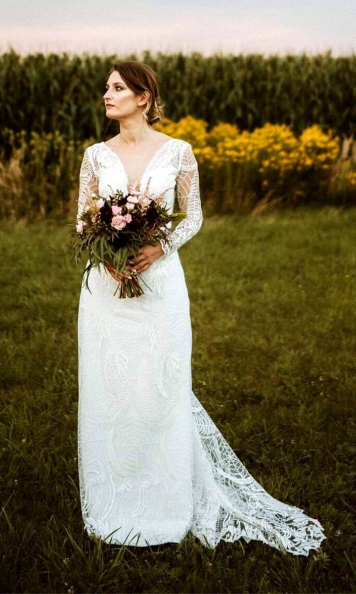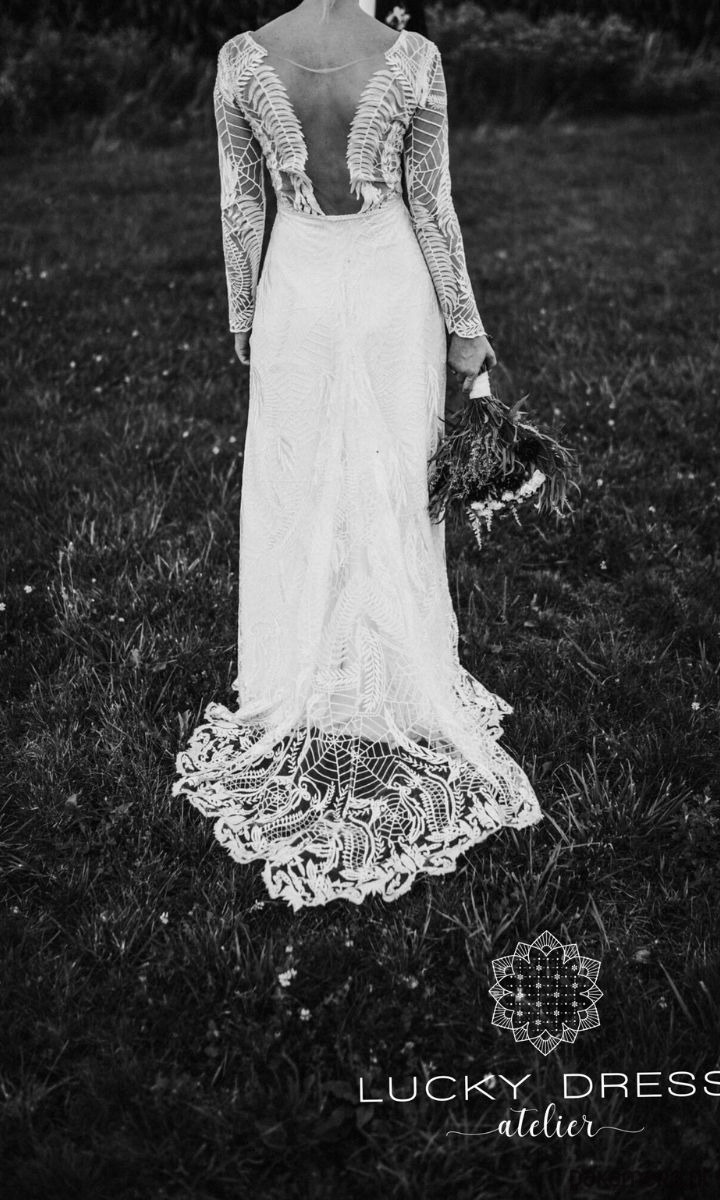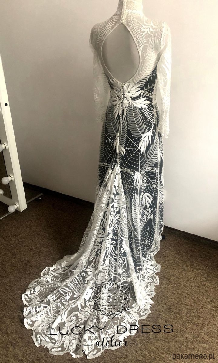 To idealna suknia ślubna jeśli marzy Ci się nietuzinkowy ślub. Charlotte – to suknia ślubna inspirowana leśnym krajobrazem, gdzie koronka o splocie pajęczyny odgrywa główną rolę! Suknia ślubna utrzymana jest w kolorystyce złamanej bieli, na koronkę z pajęczyny naszyłyśmy koronkowe aplikacje o kształcie liści paproci. Suknia ślubna Chatlotte z przodu układa się w głęboki dekolt, który zasłoniłyśmy cielistą siateczką uzyskując efekt przezroczystości, taki sam efekt uzyskałyśmy również z tyłu, gdzie Panna Młoda pokazuje niemal całe plecy. Suknia ślubna Charlotte to idealna propozycja na uroczystości w stylu boho, rustykalnym, alternatywnym a może nawet gotyckim!