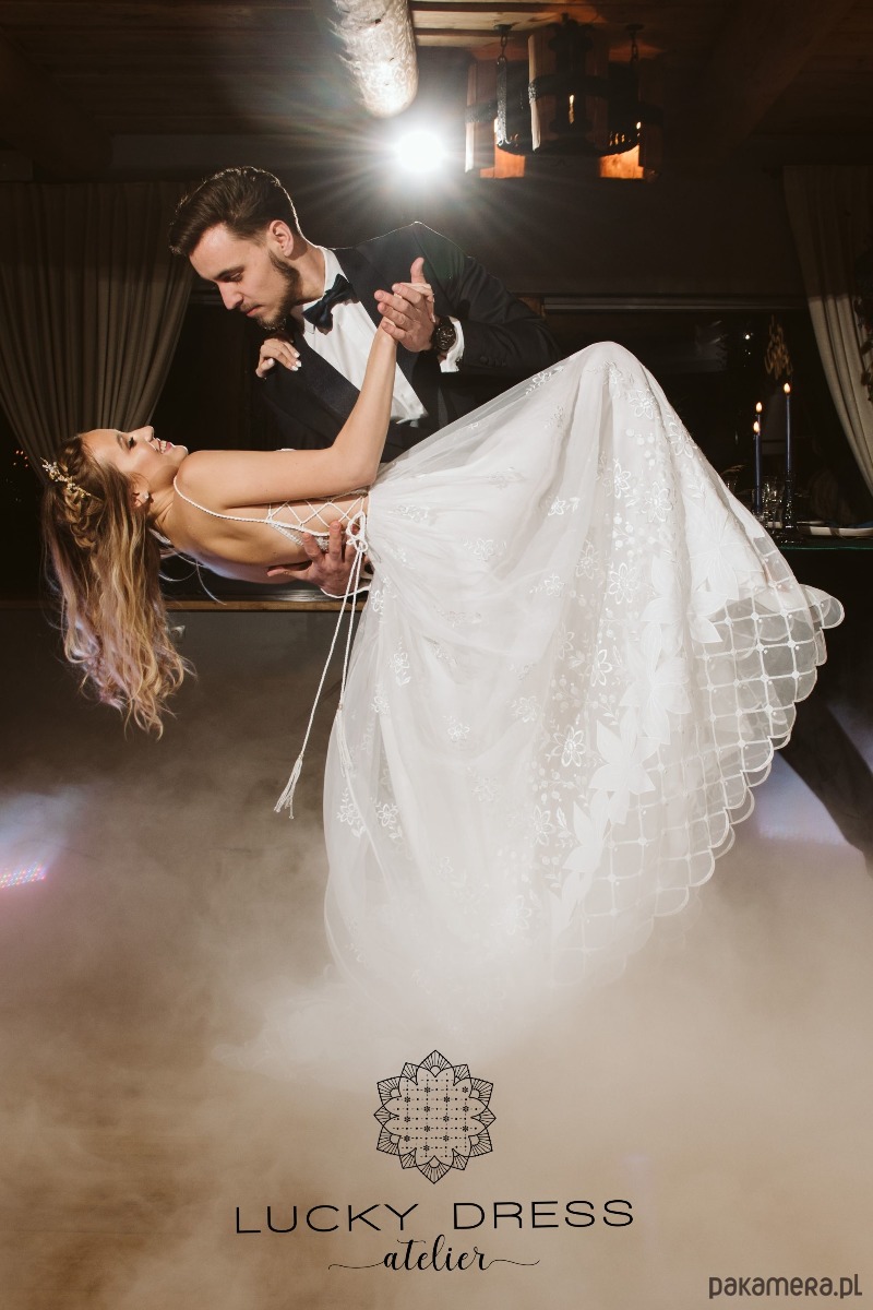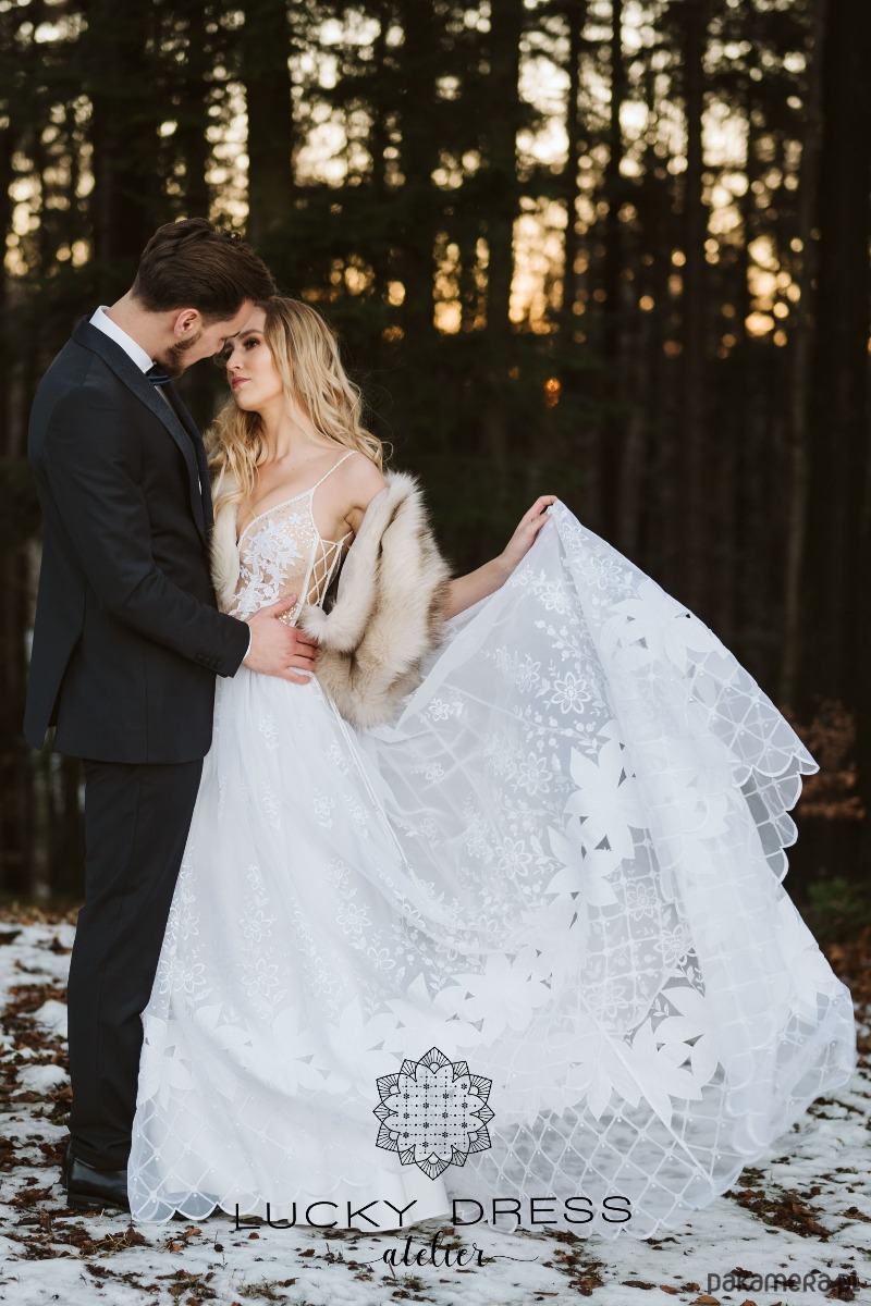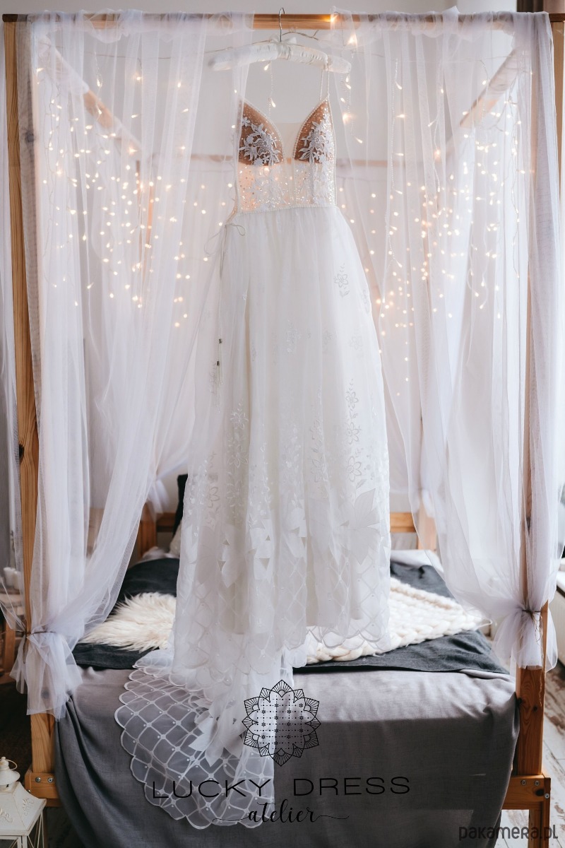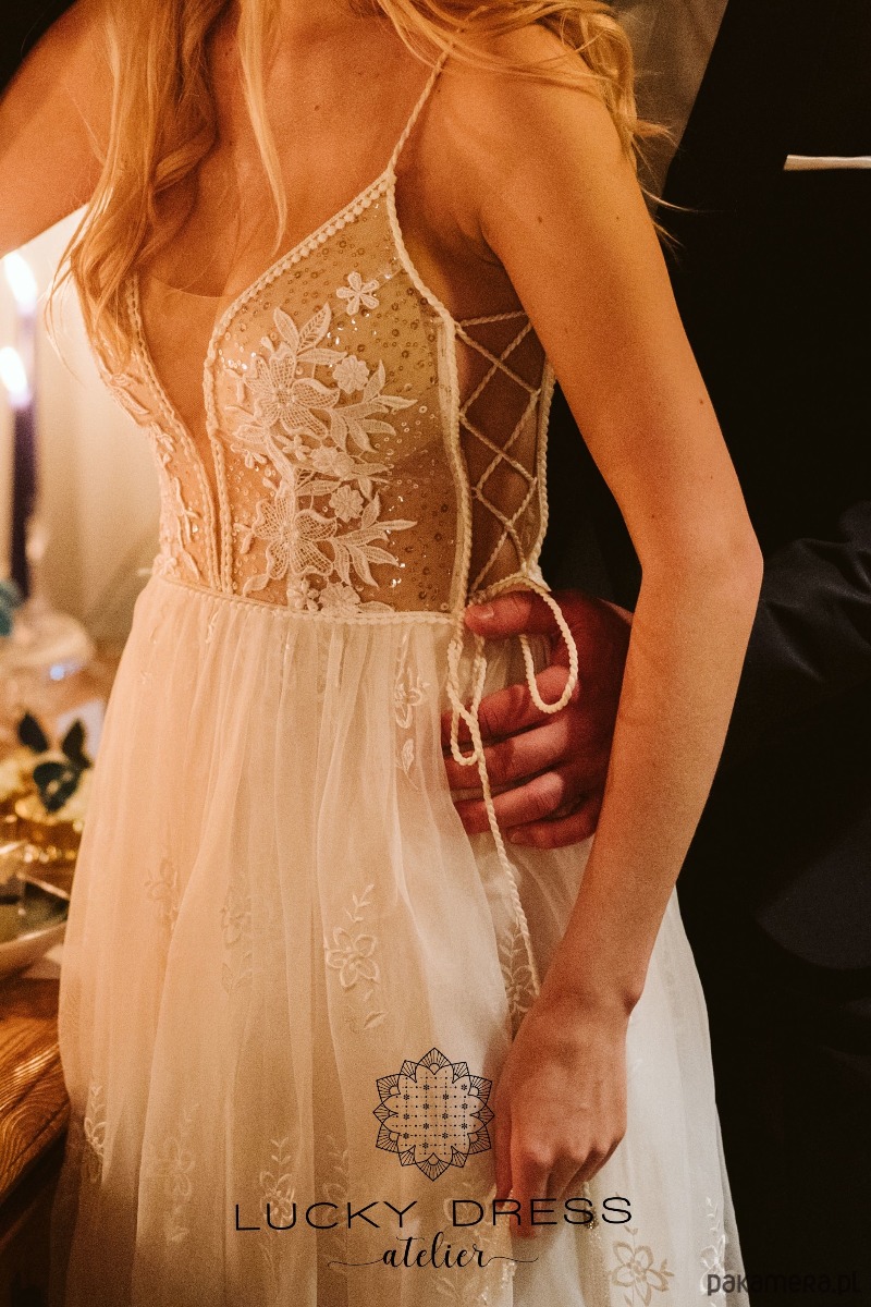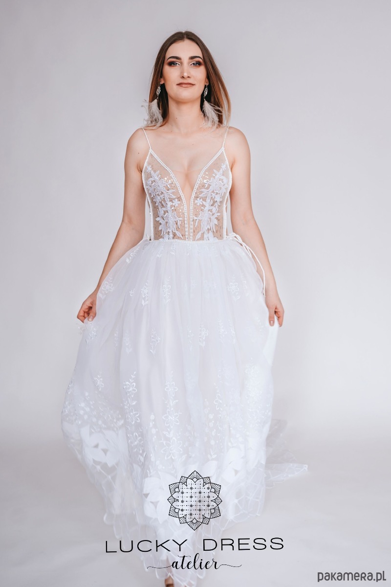 Victoria to suknia ślubna zaprojektowana w naszym Krakowskim atelier. Victoria to suknia ślubna o kroju litery A w kolorze nude (góra) oraz białym (dół). Górę tej sukni ślubnej uszyłyśmy z dwóch warstw siateczki w odcieniu nude, jedna z nich jest zdobiona cekinami, dzięki czemu daje efekt glitter. Na siateczkę naszyłyśmy przepiękną aplikację koronkową o motywie kwiatów i liści. Z przodu utworzyłyśmy głęboki dekolt V, który ozdobiłyśmy bawełnianą tasiemką oraz gołe plecy. Suknia ślubna posiada bardzo cienkie ramiączka oraz wycięcia po bokach, które można regulować sznurkami zakończonymi ozdobą z koralików. Dół sukni ślubnej uszyłyśmy natomiast z lekkiej satynowej podszewki w kolorze złamanej bieli (off white) oraz jednej warstwy pięknie haftowanej organzy w kolorze białym. Suknia ślubna została zwieńczona trenem. W tej sukni ślubnej nie sposób się nie zakochać!
