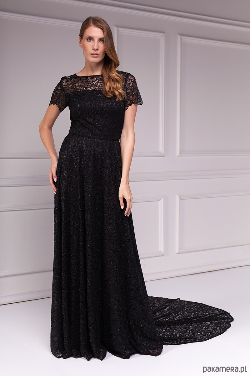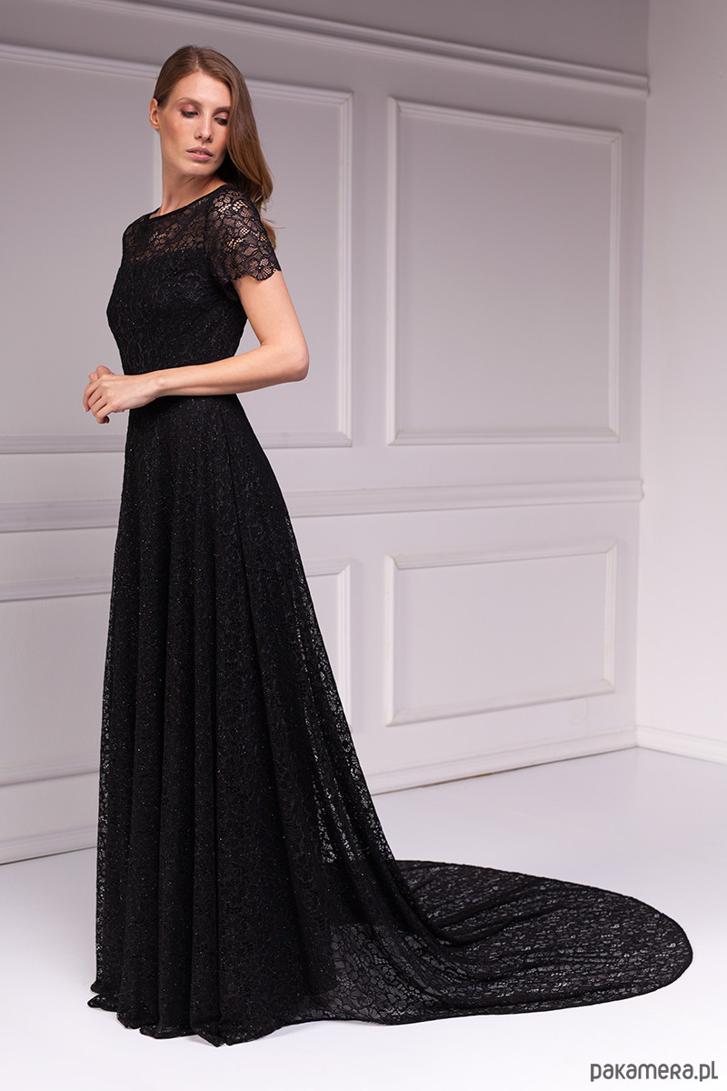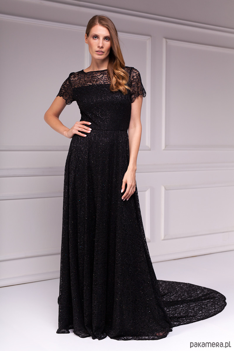 Suknia wieczorowa z ekskluzywnej kolekcji Premium uszyta z luksusowej koronki w kolorze czarnym z brokatem, na podszewce. Góra dopasowana, lekko elastyczna zaznaczoną linią ramion i krótkimi rękawami. Dół obszerny, rozkloszowany z trenem. Zamek kryty z tyłu, długość na wzrost około 178 cm.