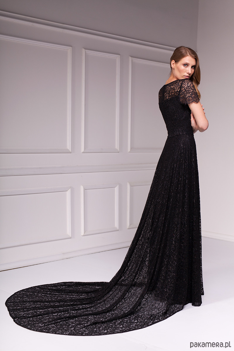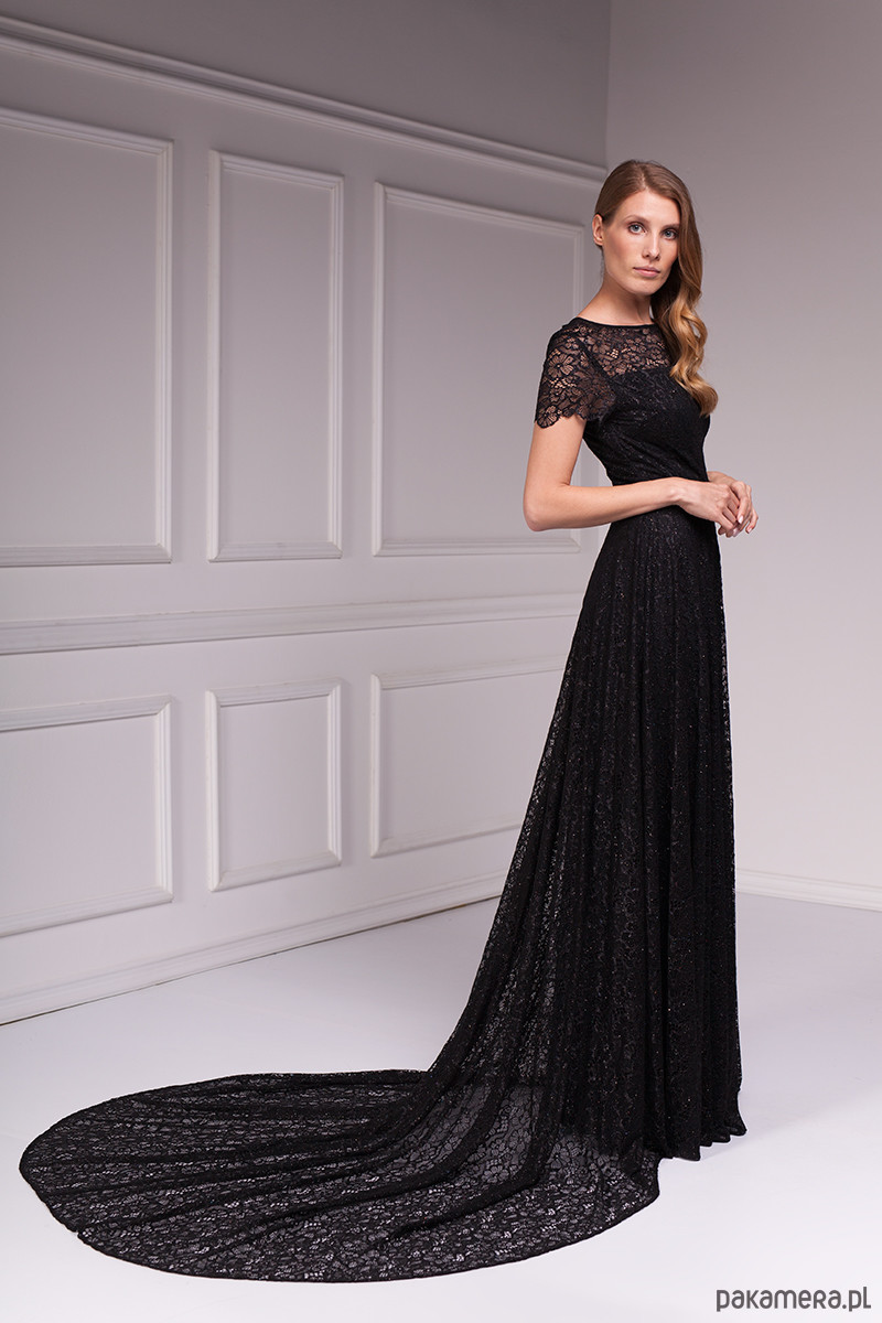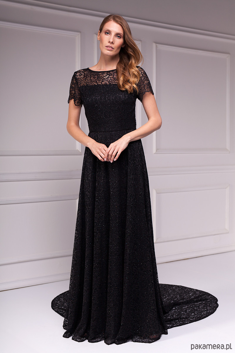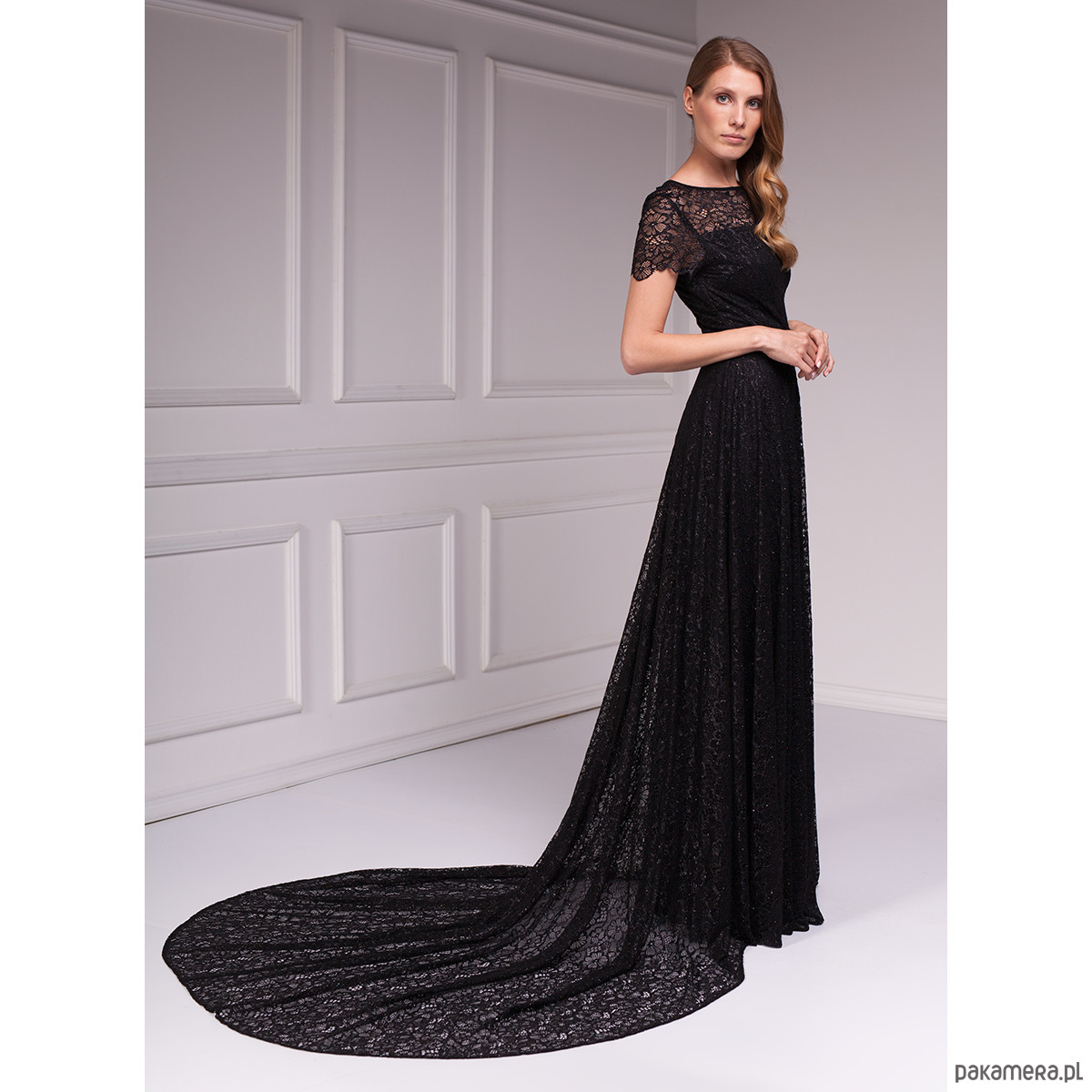 Suknia wieczorowa z ekskluzywnej kolekcji Premium uszyta z luksusowej koronki w kolorze czarnym z brokatem, na podszewce. Góra dopasowana, lekko elastyczna zaznaczoną linią ramion i krótkimi rękawami. Dół obszerny, rozkloszowany z trenem. Zamek kryty z tyłu, długość na wzrost około 178 cm.