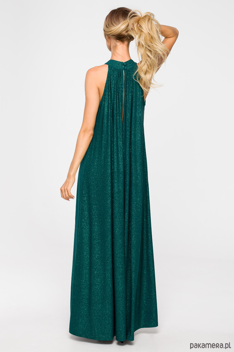 Jedna suknia i kilka możliwości stylizacji. Rozkloszowany fason w wersji maksi z dekoltem typu halter to sprawdzone rozwiązanie dla pań ceniących sobie swobodę, lub chcących zamaskować mankamenty figury.