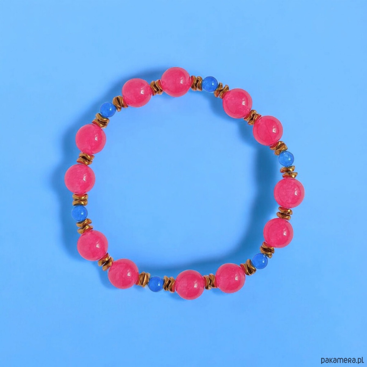 Kolorowa i niepoważna bransoletka na solidnej lince elastycznej, wykonana z jadeitu w soczystych kolorach (8 i 4mm) - koralowy róż + niebieski - oraz licznych przekładek ze złotego hematytu.