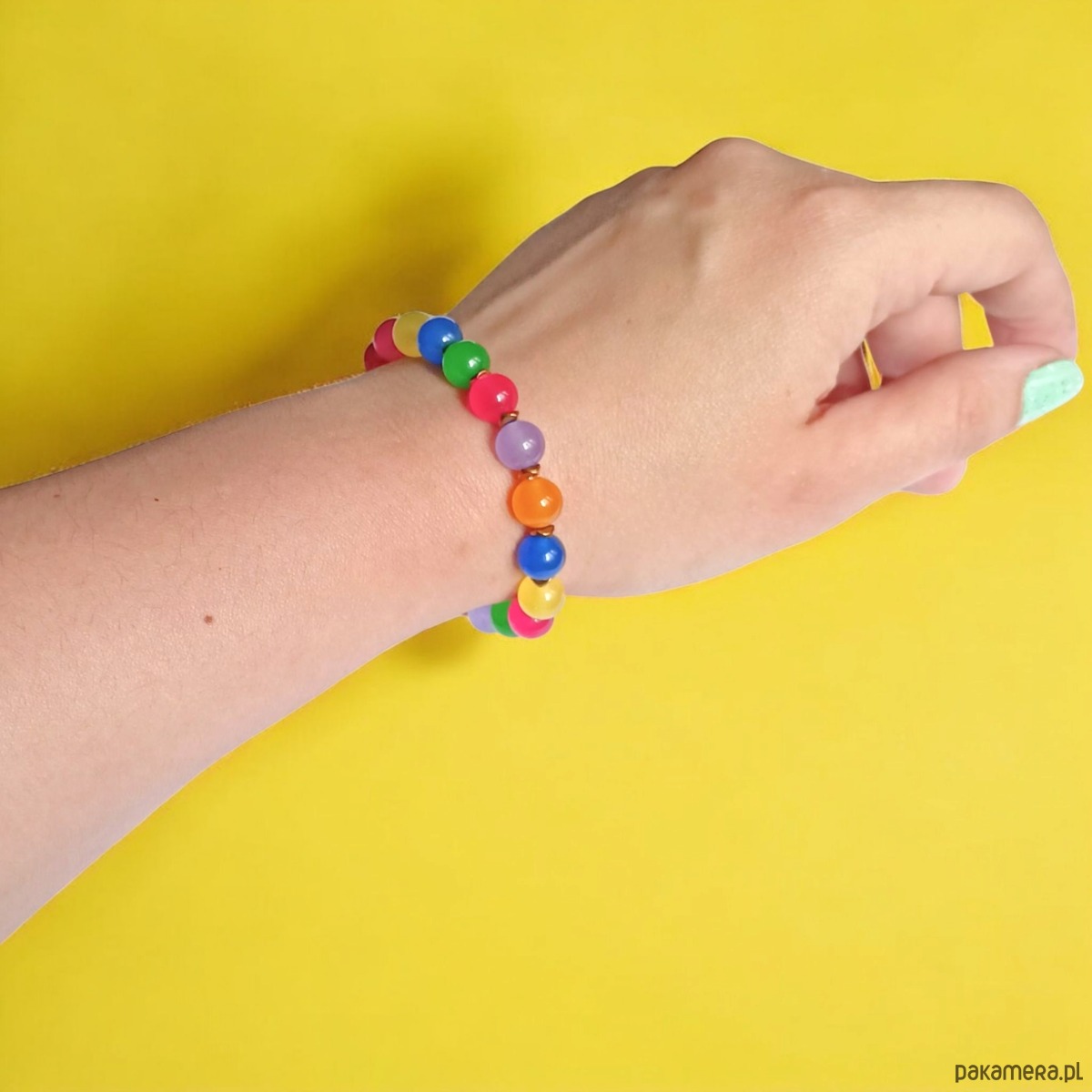 Kolorowa i niepoważna bransoletka na solidnej lince elastycznej, wykonana z jadeitu w soczystych kolorach (8mm) oraz licznych przekładek ze złotego hematytu.