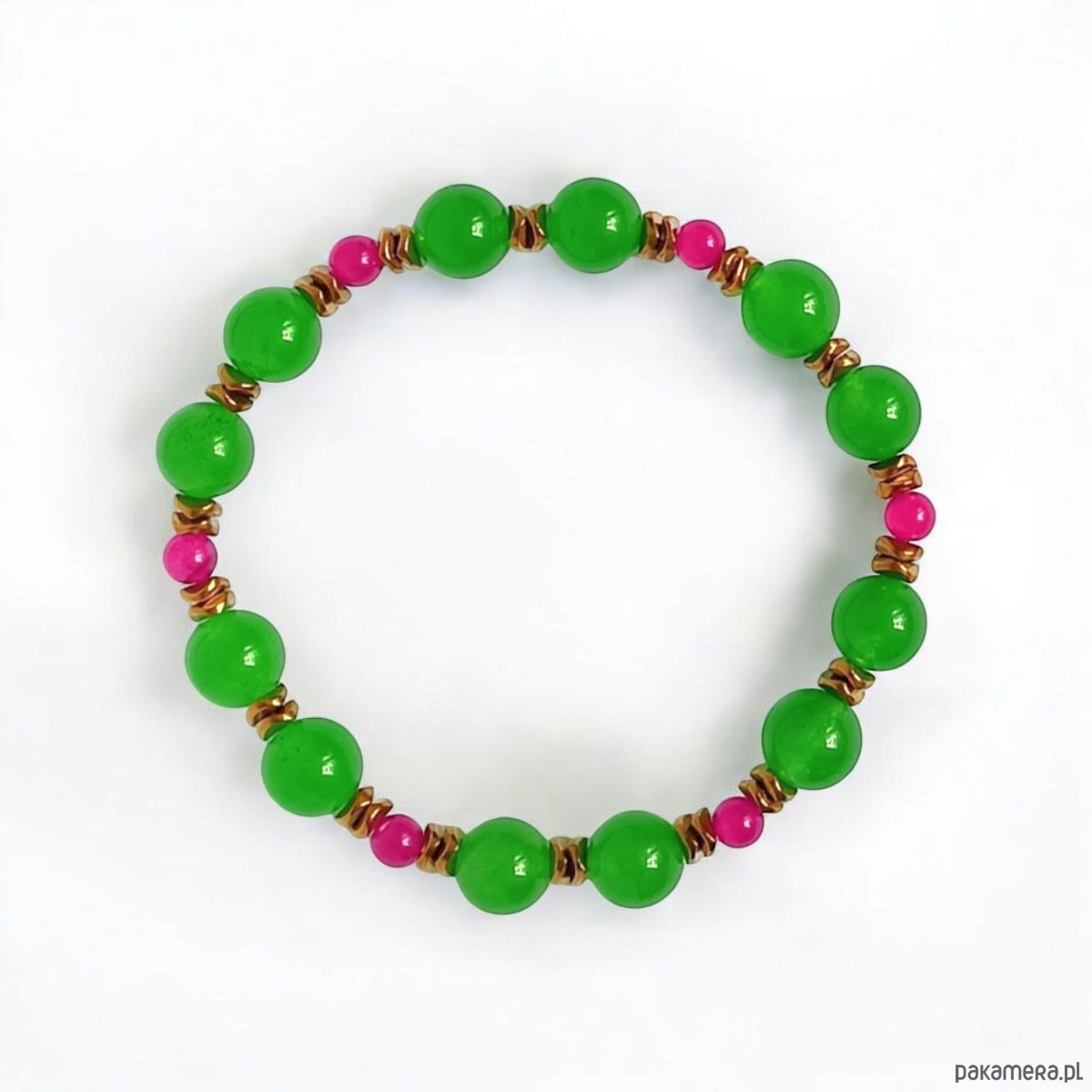 Kolorowa i niepoważna bransoletka na solidnej lince elastycznej, wykonana z jadeitu w soczystych kolorach (8 i 4mm) - zieleń+ fuksja - oraz licznych przekładek ze złotego hematytu.