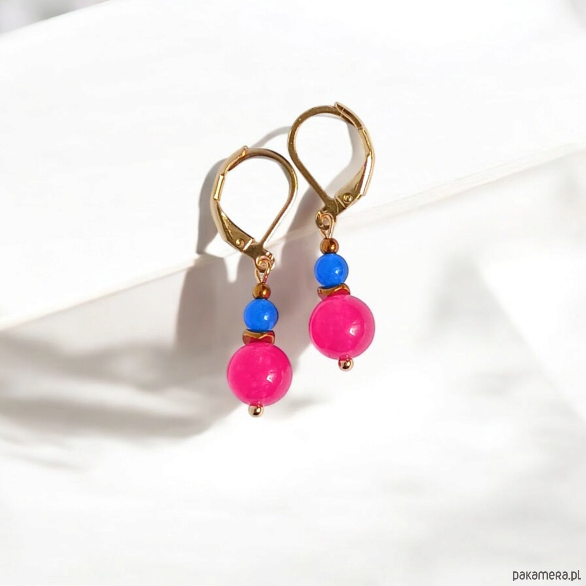 Kolorowe i niepoważne kolczyki wykonane z jadeitu w soczystych kolorach (8 i 4mm) -koralowy róż + niebieski- oraz przekładek ze złotego hematytu.