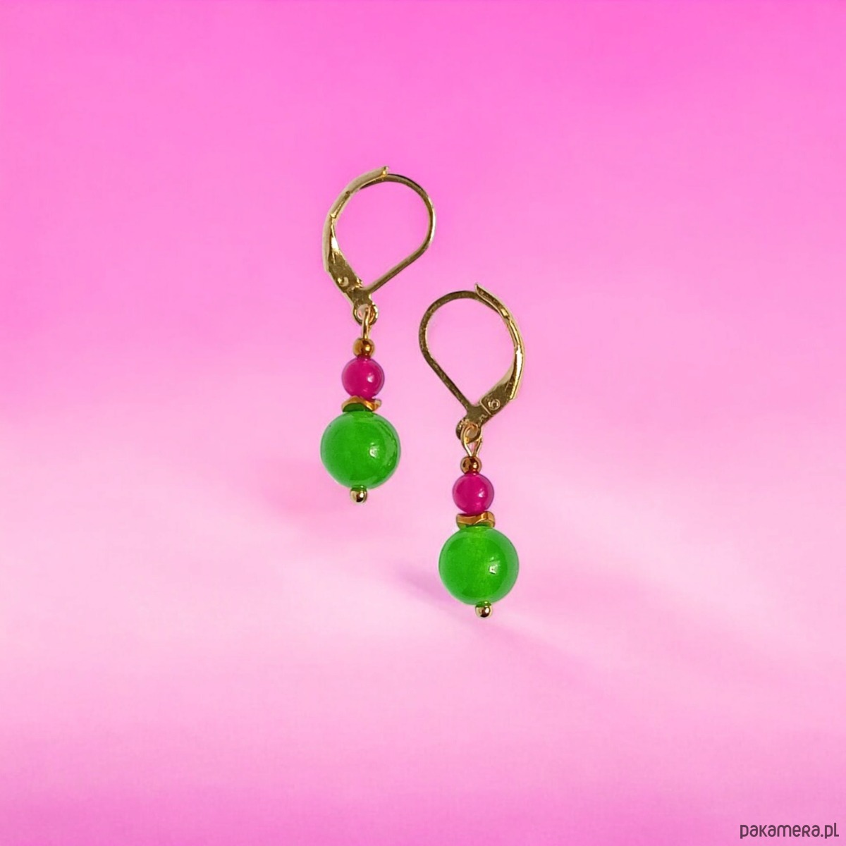 Kolorowe i niepoważne kolczyki wykonane z jadeitu w soczystych kolorach (8 i 4mm) -zieleń + fuksja- oraz przekładek ze złotego hematytu.
