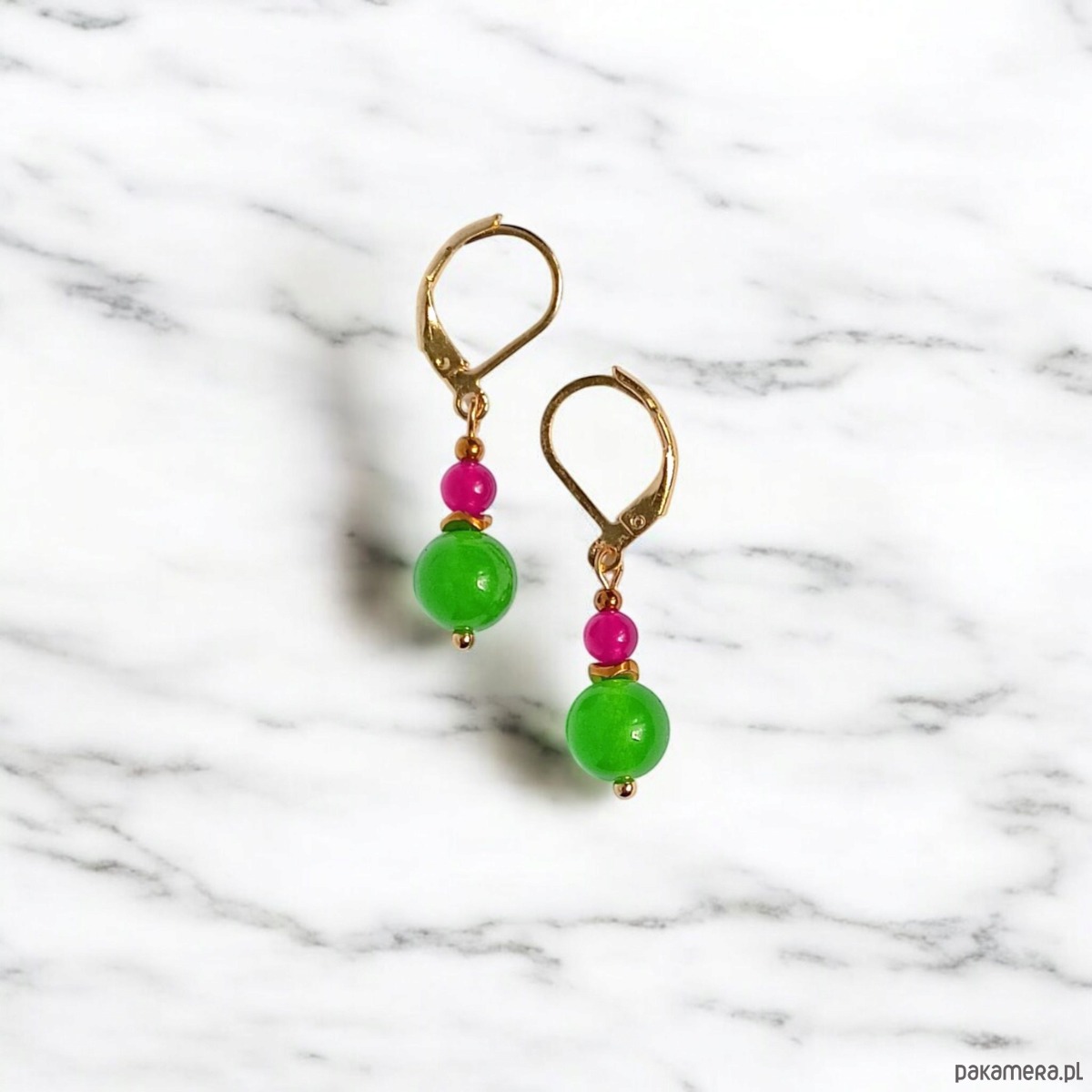 Kolorowe i niepoważne kolczyki wykonane z jadeitu w soczystych kolorach (8 i 4mm) -zieleń + fuksja- oraz przekładek ze złotego hematytu.
