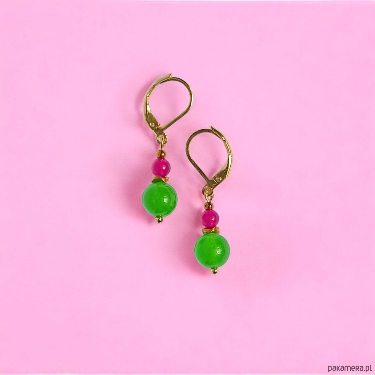Kolorowe i niepoważne kolczyki wykonane z jadeitu w soczystych kolorach (8 i 4mm) -zieleń + fuksja- oraz przekładek ze złotego hematytu.