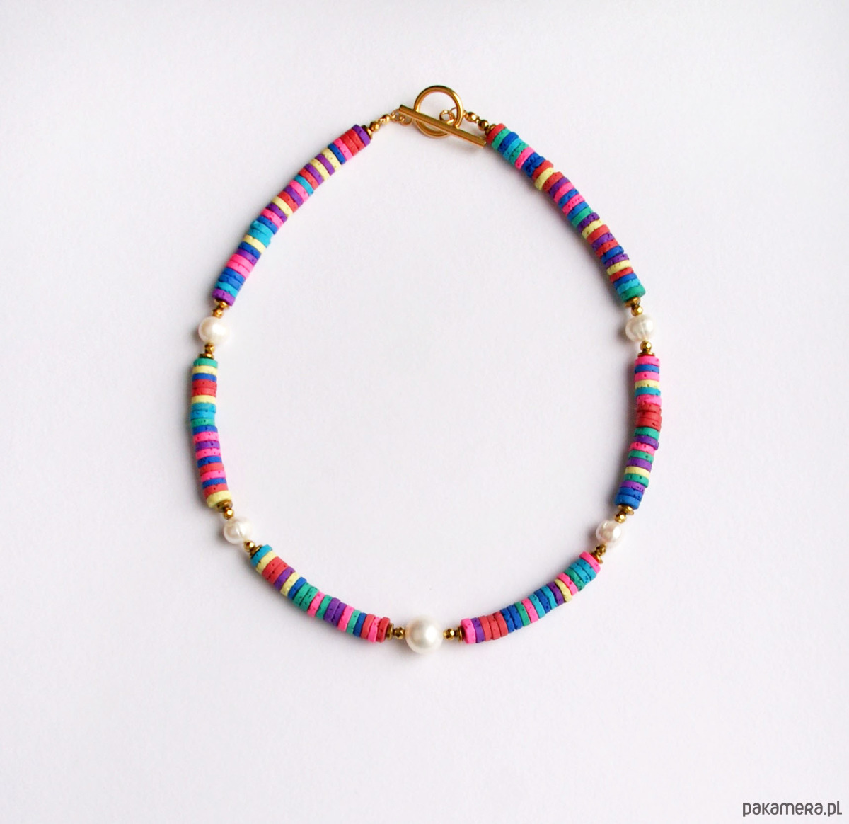 niebanalny naszyjnik wykonany z kolorowej, porowatej lawy (plasterki 6mm) z dodatkiem lekko nieregularnych pereł naturalnych, słodkowodnych w klasycznym odcieniu złamanej bieli. wielkość pereł: ok. 7 i 9mm. przekładki wykonane ze złotego hematytu.