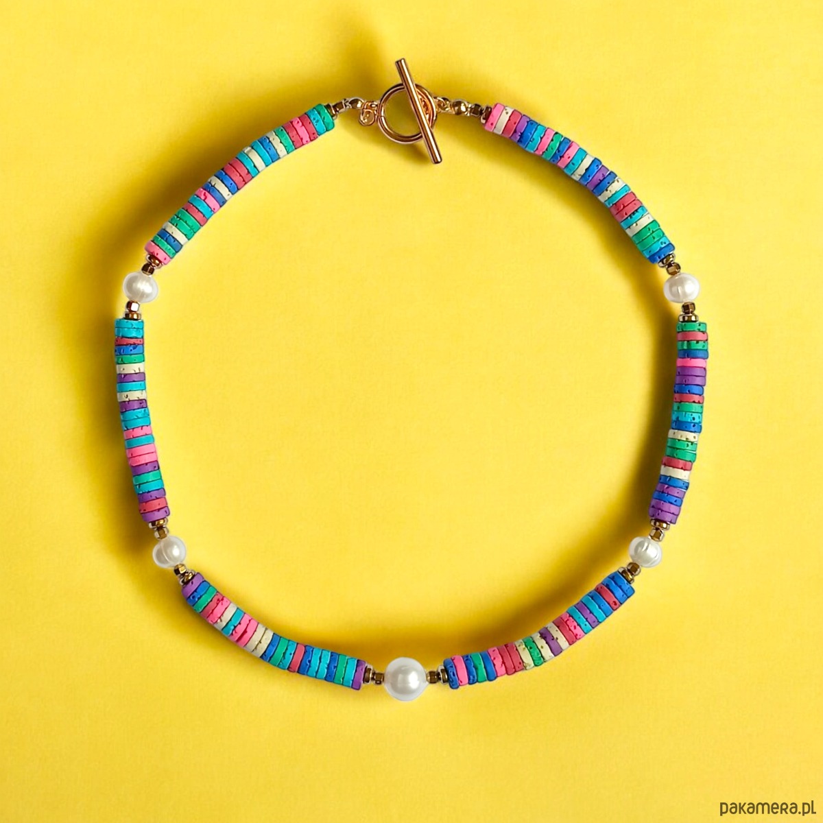 niebanalny naszyjnik wykonany z kolorowej, porowatej lawy (plasterki 6mm) z dodatkiem lekko nieregularnych pereł naturalnych, słodkowodnych w klasycznym odcieniu złamanej bieli. wielkość pereł: ok. 7 i 9mm. przekładki wykonane ze złotego hematytu.