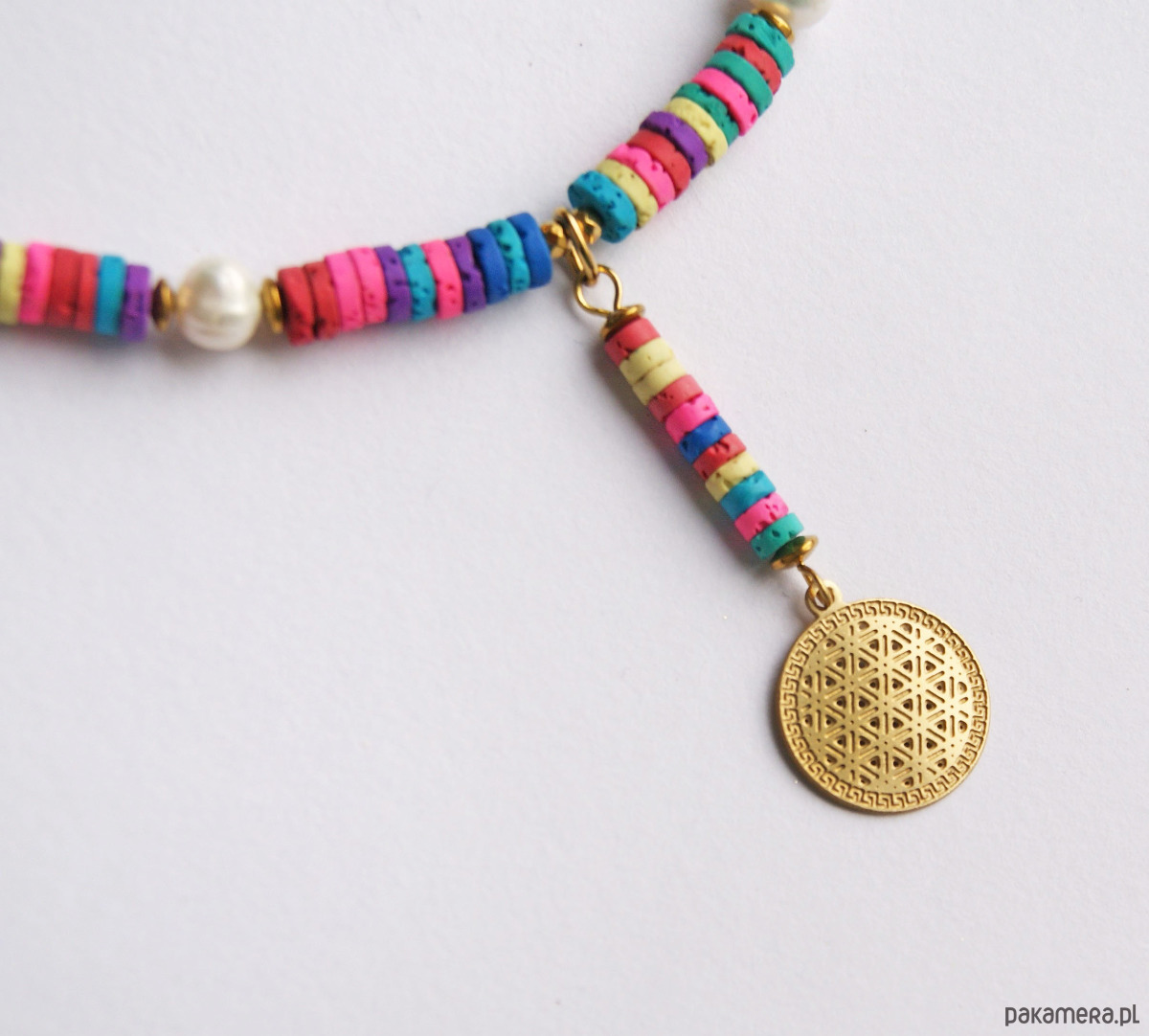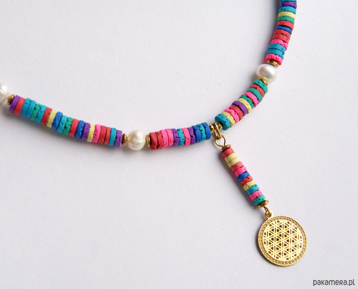niebanalny naszyjnik wykonany z kolorowej, porowatej lawy (plasterki 6mm) z dodatkiem lekko nieregularnych pereł naturalnych, słodkowodnych w klasycznym odcieniu złamanej bieli. wielkość pereł: ok. 7mm. przekładki wykonane ze złotego hematytu.