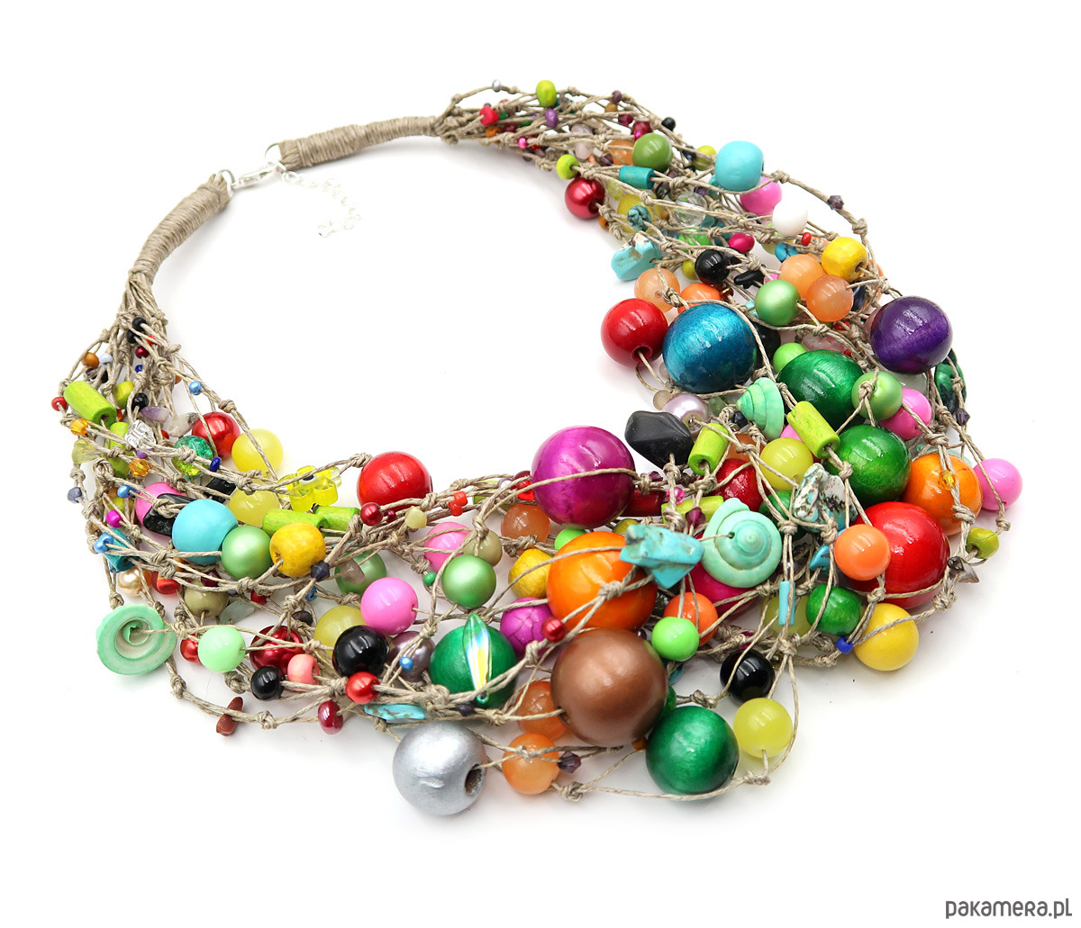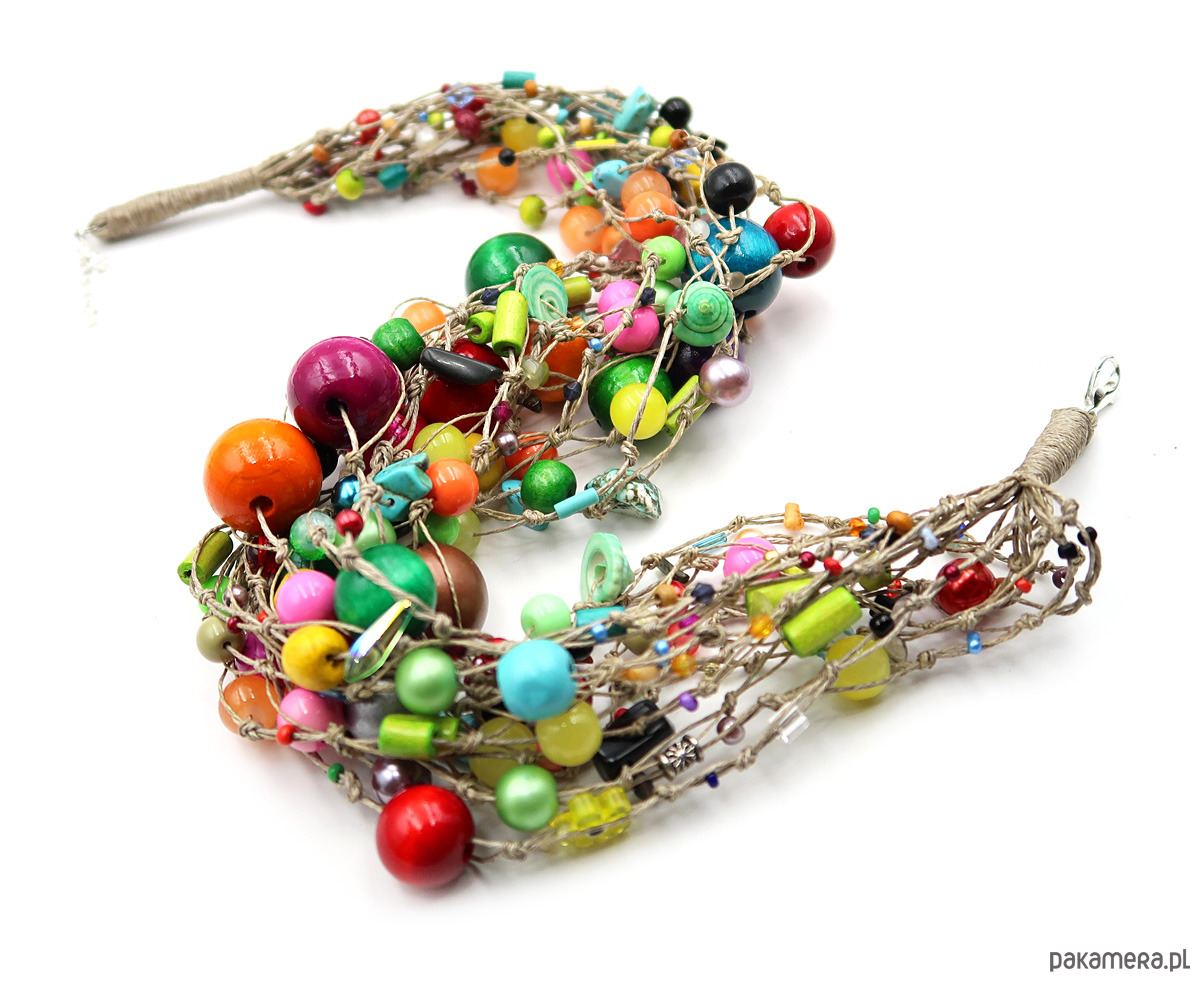 Bogaty lniany naszyjnik wykonany na kilkudziesięciu sznureczkach przędzy lnianej z wielobarwnych korali i minerałów. W splocie znalazły się; korale szklane, masa perłowa, muszle, akryl, szklane perełki, drewno i garść minerałów. Długość naszyjnika mierzona po zapięciu ok. 48 cm + regulacja długości. Zapięcie posrebrzane.