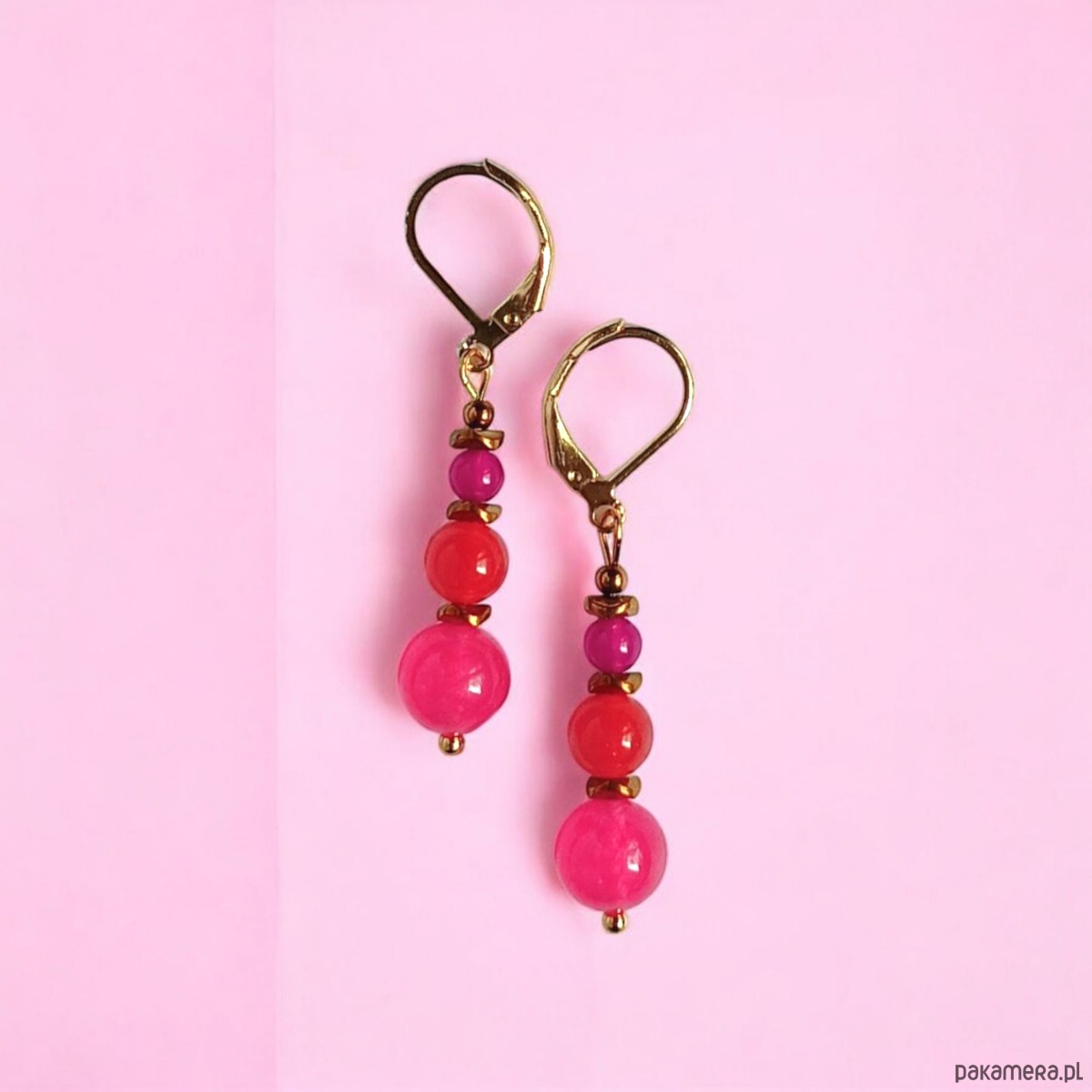 Kolorowe i niepoważne kolczyki wykonane z jadeitu w soczystych kolorach (8, 6 i 4mm) oraz przekładek ze złotego hematytu.