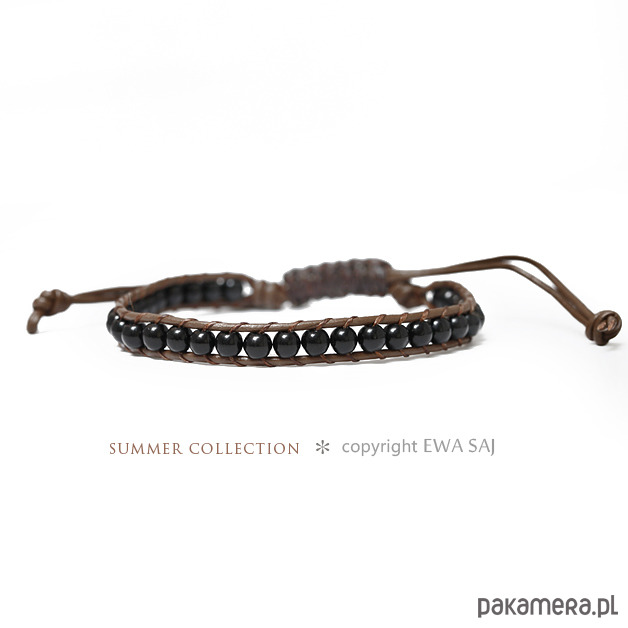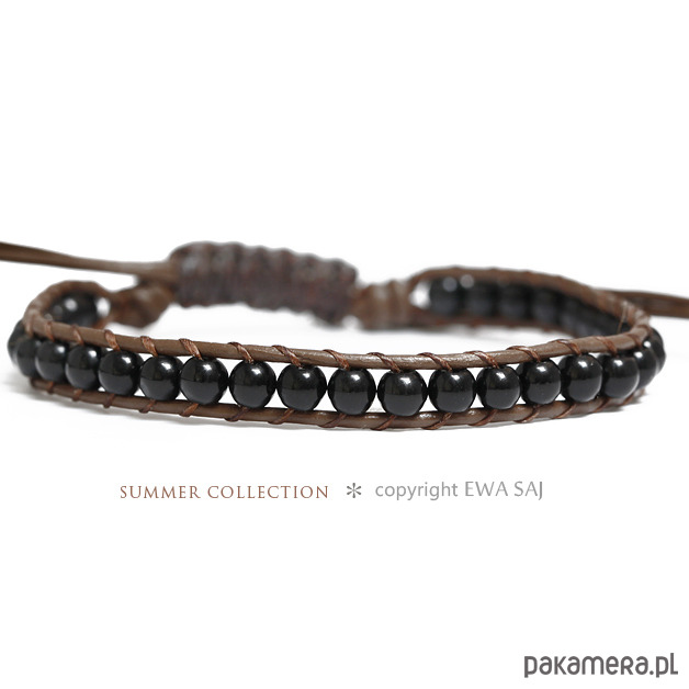 Delikatna, piękna bransoletka wykonana z 4 mm koralików czzarnego onyksu oraz skórzanego rzemyka o grubości 1 mm. Zaciskowe zapięcie pozwala na dostosowanie wielkości do każdego nadgarstka. Idealna na nadgarstek 13-17 cm. copyright Ewa Saj. All Rights Reserved