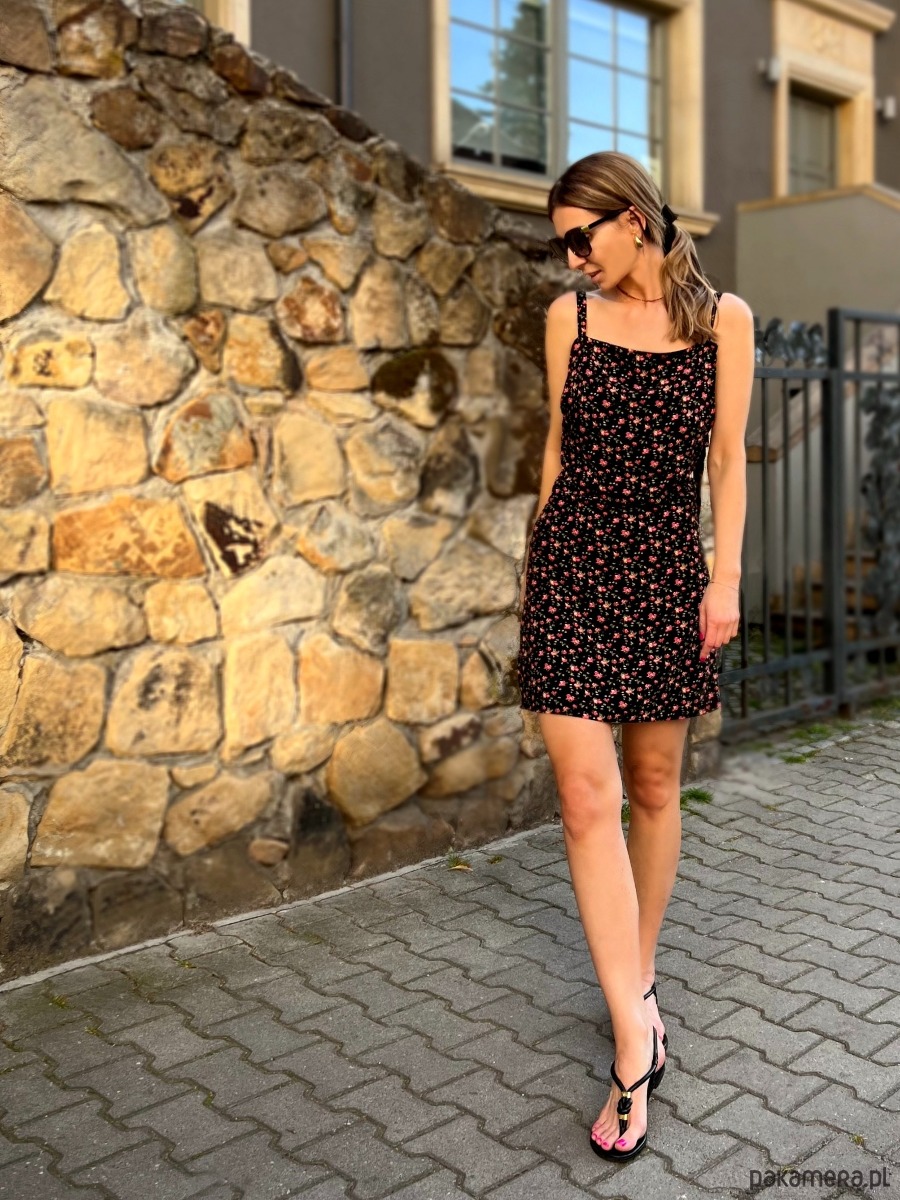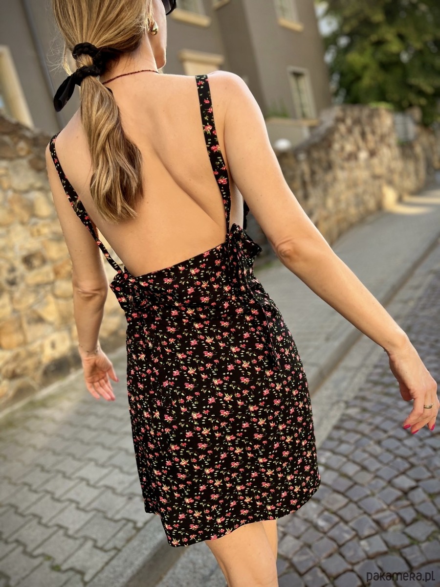 Uszyta z miękkiej, oddychającej wiskozy. Charakteryzuje się zmysłowym, delikatnie taliowanym krojem, długimi ramiączkami z wiązaniem na urocze kokardy, pozwalającym regulować długość sukienki i głębokość dekoltu. Otwarte plecy, nadają charakteru.