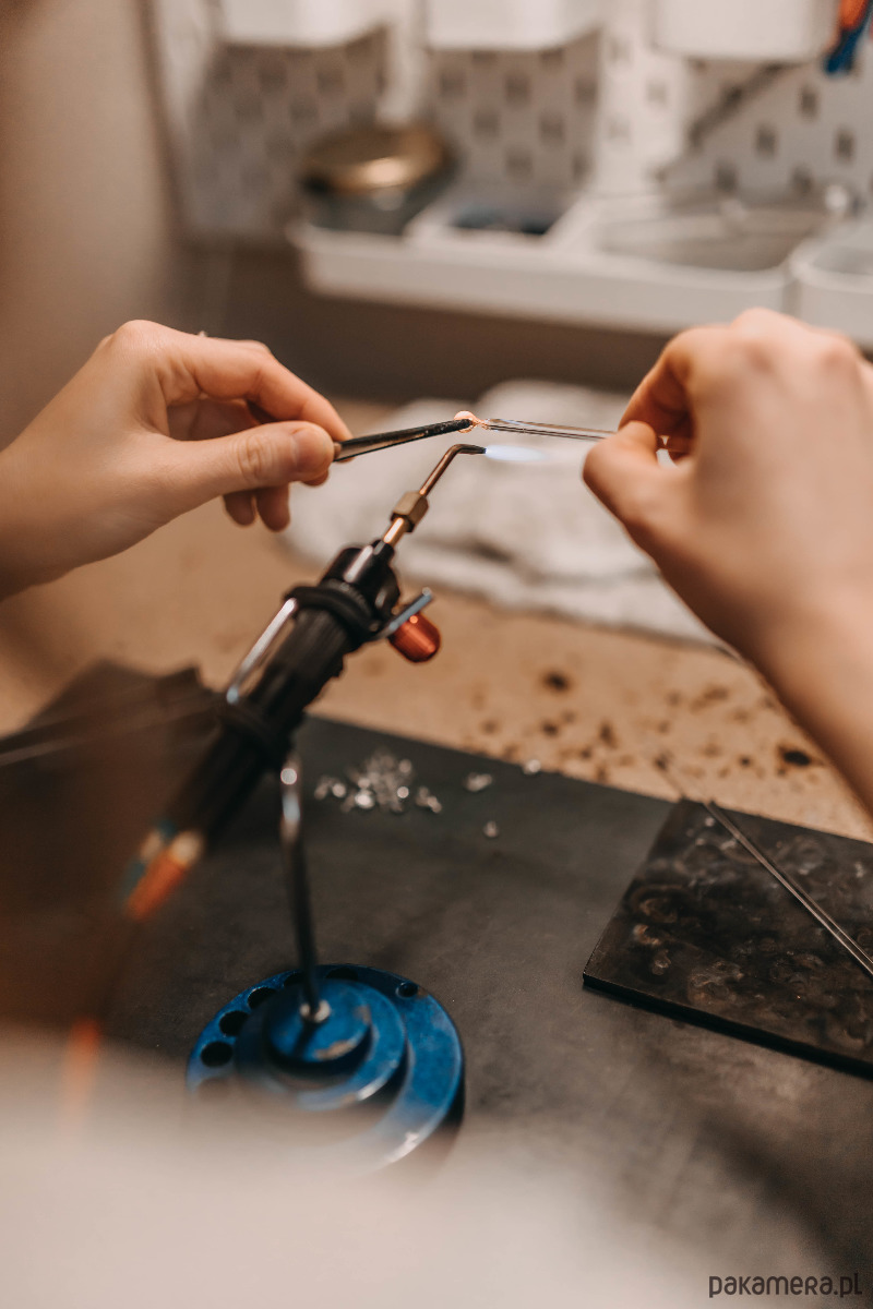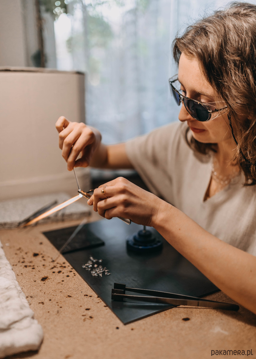 Każda sztuka robiona jest przeze mnie ręcznie w płomieniu palnika, przez co zyskuje niepowtarzalny charakter. W związku z tym każdy egzemplarz i rozłożenie na nim płatków złota może się delikatnie różnić.