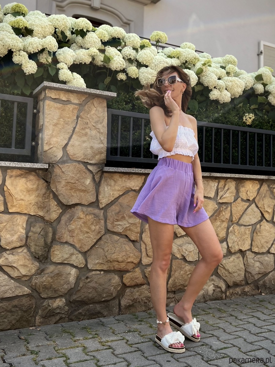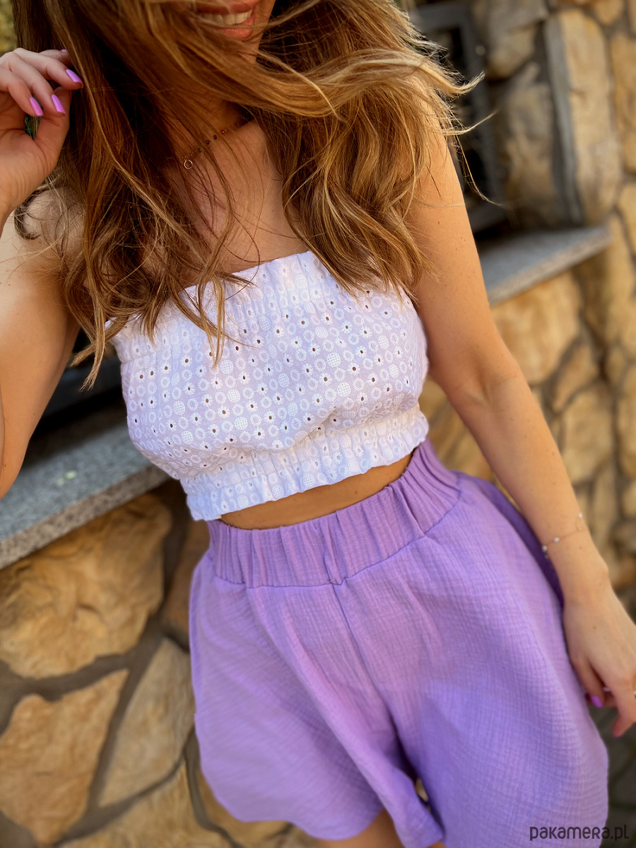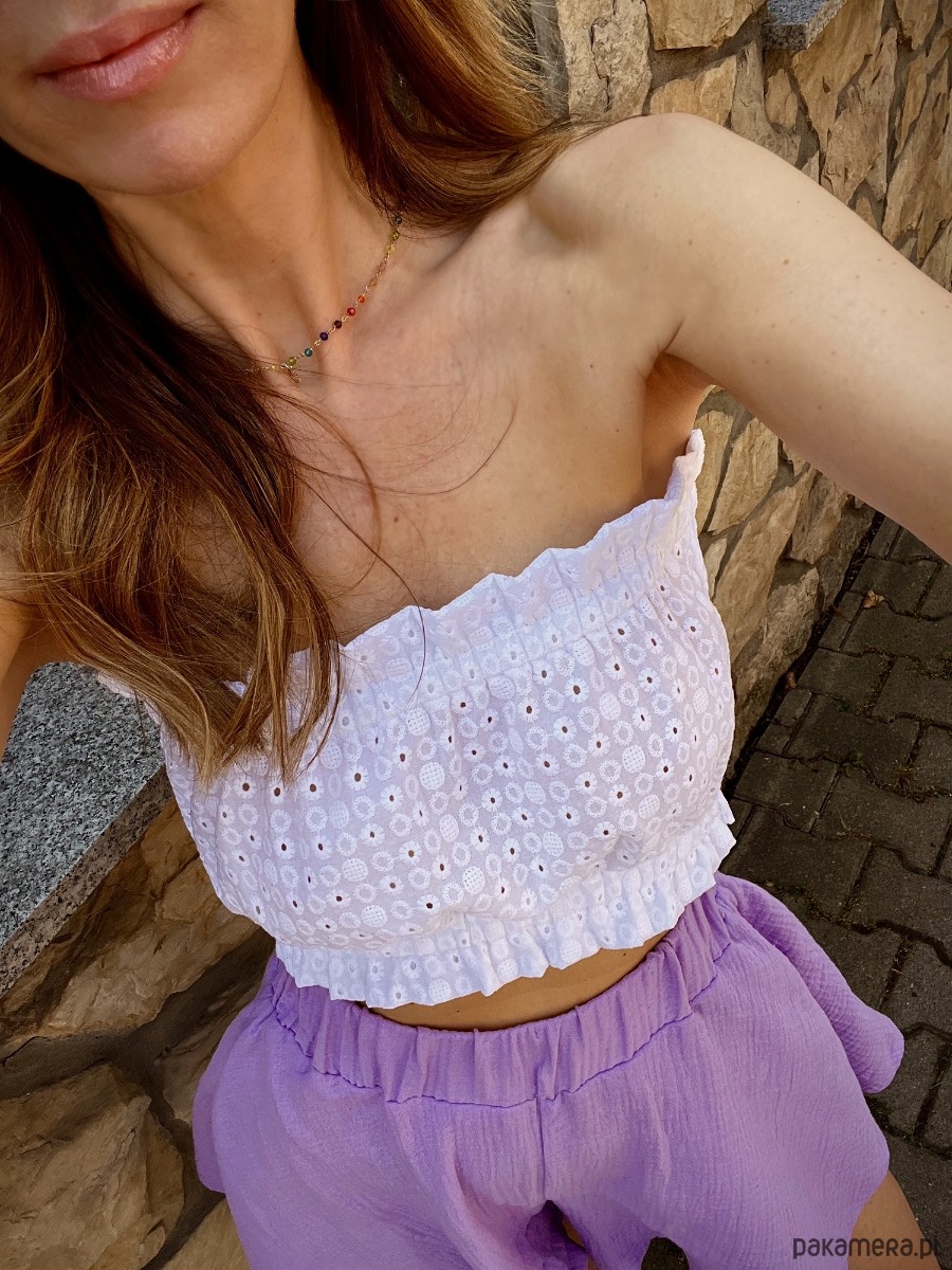 Taki top to must have w najgorętsze dni lata. Wykonany ze 100%, haftowanej bawełny. Świetnie wygląda zarówno na plaży, jak i pod marynarką.